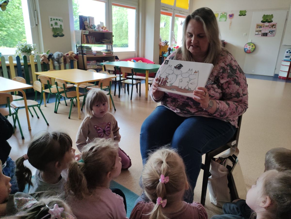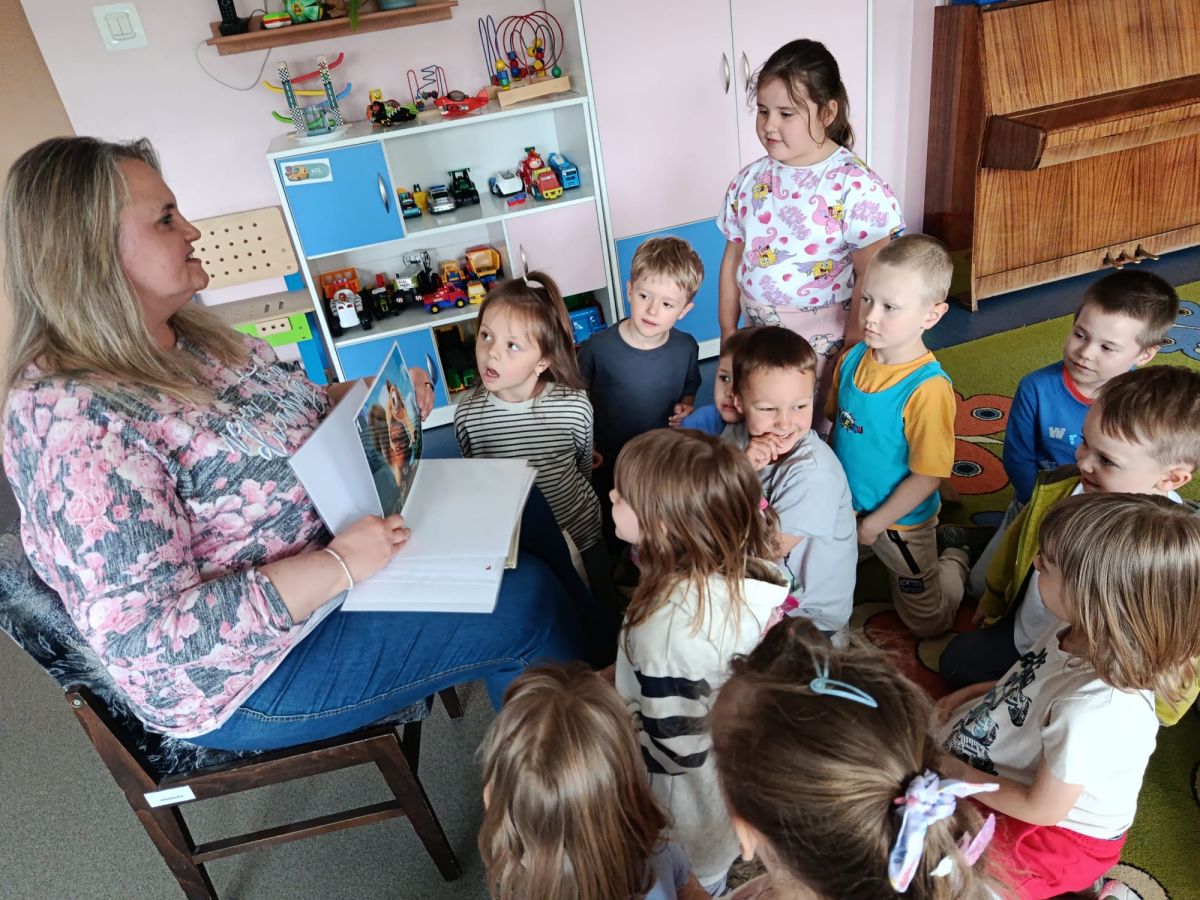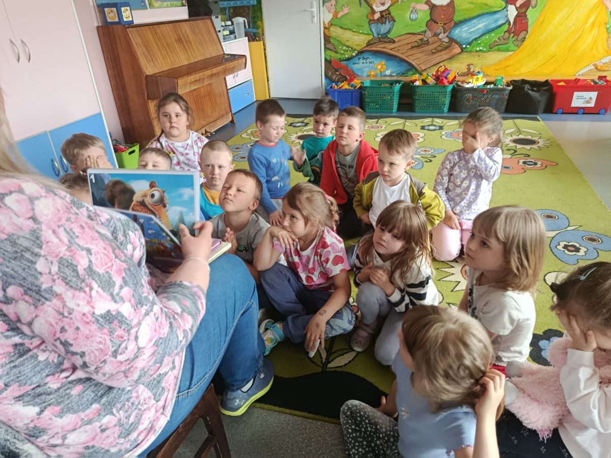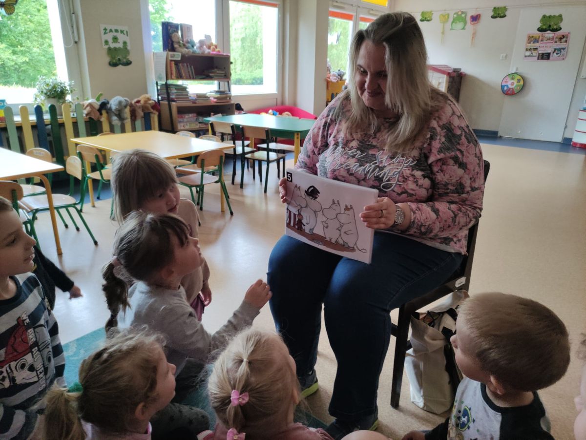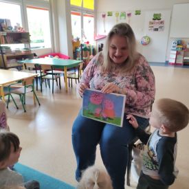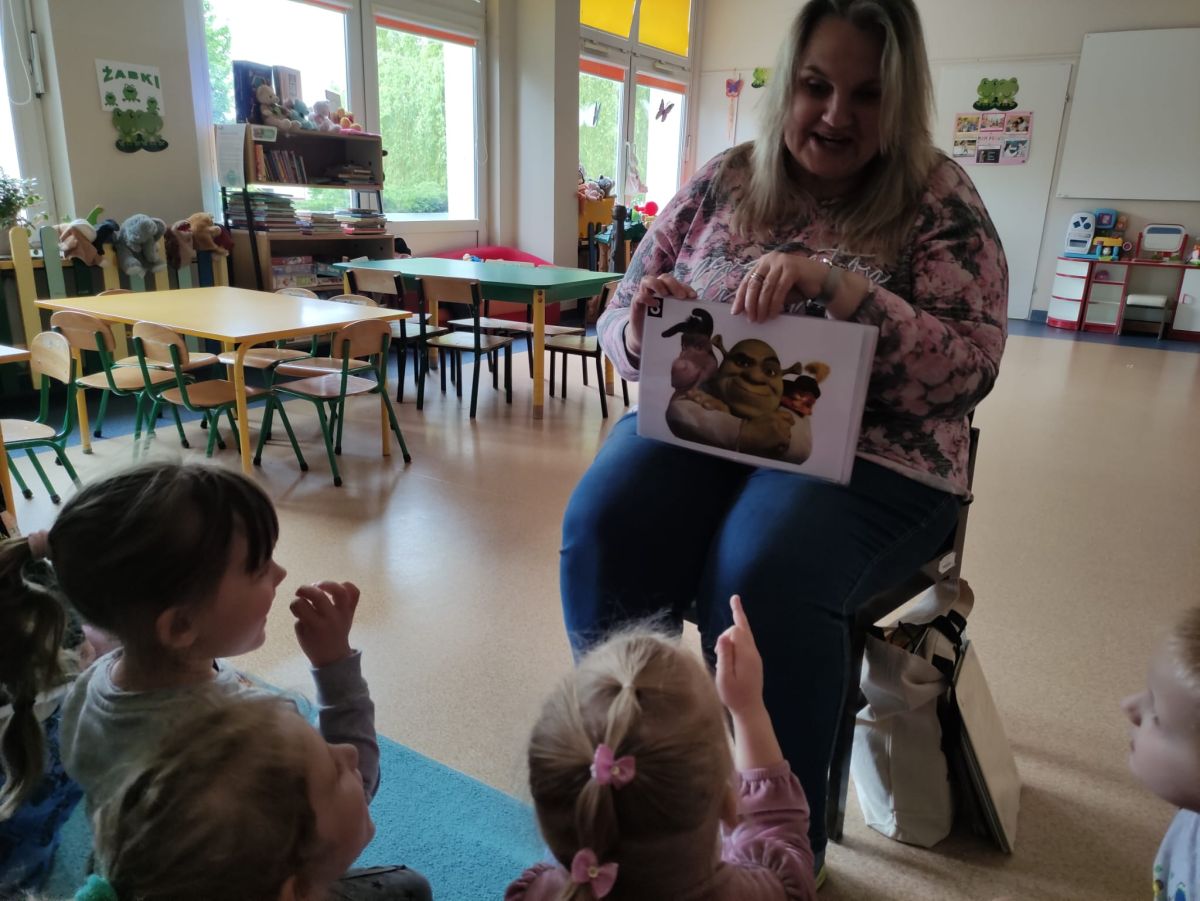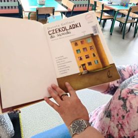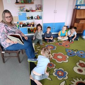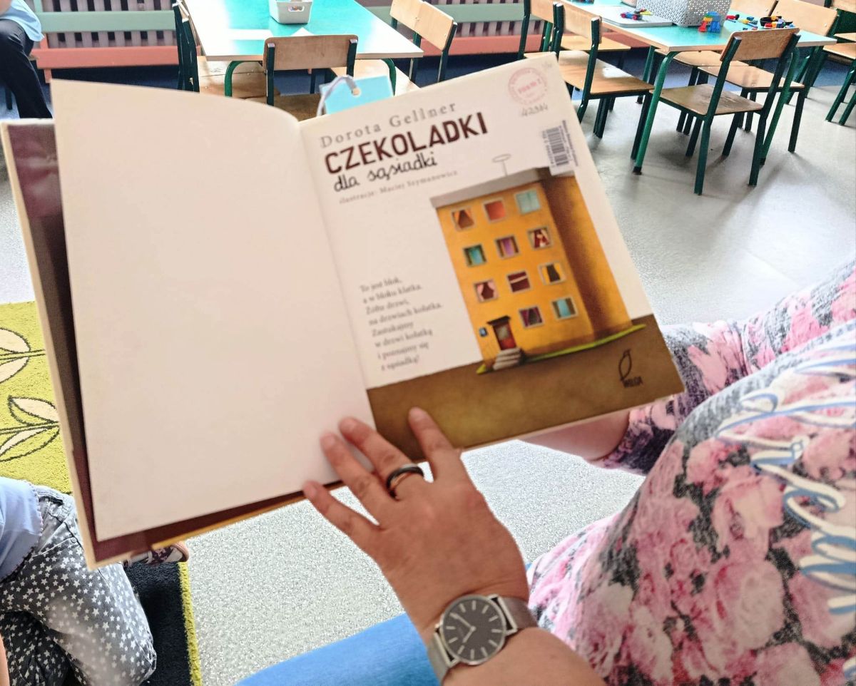 16 maja dzieci z grupy Żabek i Motylków odwiedziła Pani Ania - bibliotekarka z Miejskiej Biblioteki Publicznej Filii nr 2 w ramach akcji Cała Polska Czyta Dzieciom. Pani Ania czytała dzieciom pełne humoru, momentami zwariowane opowiastki o sąsiadce, pudlu i kocie autorstwa Doroty Gellner pt. "Czekoladki dla sąsiadki". Wysłuchane opowiadania oraz przygotowane przez bibliotekarkę zagdaki wprawiły dzieci w doskonały nastrój. Na zakończenie spotkania dzieci podziękowały Pani Ani i obiecały odwiedzić bibliotekę z rodzicami.