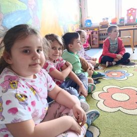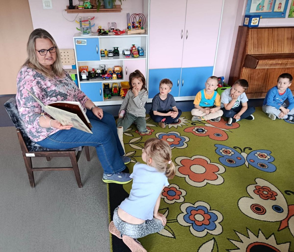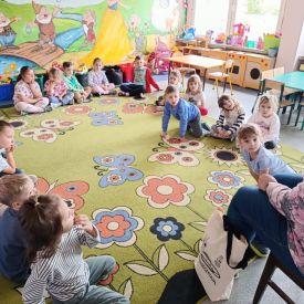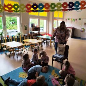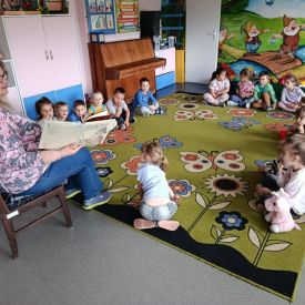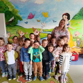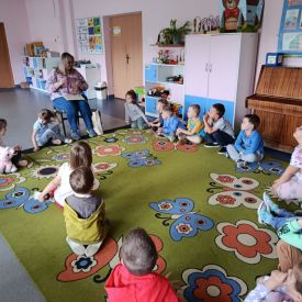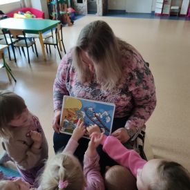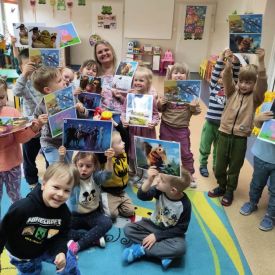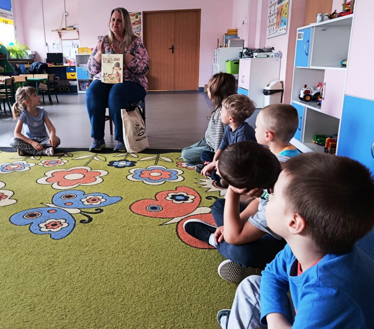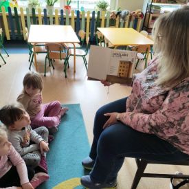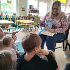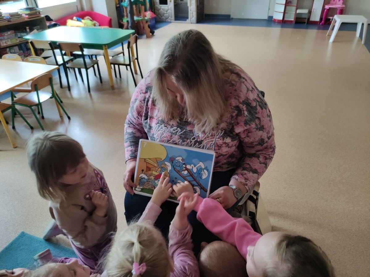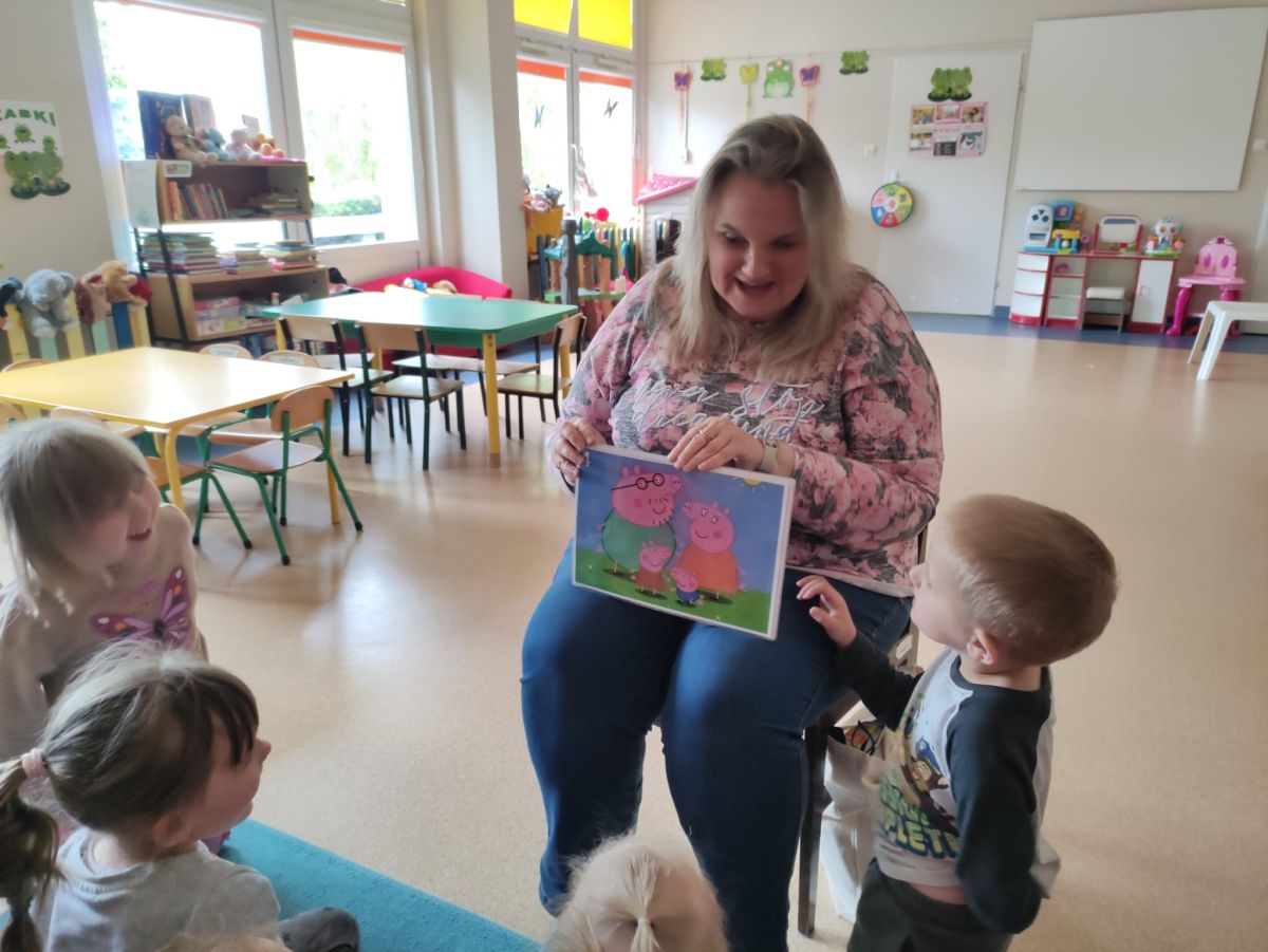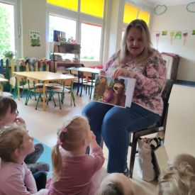 16 maja dzieci z grupy Żabek i Motylków odwiedziła Pani Ania - bibliotekarka z Miejskiej Biblioteki Publicznej Filii nr 2 w ramach akcji Cała Polska Czyta Dzieciom. Pani Ania czytała dzieciom pełne humoru, momentami zwariowane opowiastki o sąsiadce, pudlu i kocie autorstwa Doroty Gellner pt. "Czekoladki dla sąsiadki". Wysłuchane opowiadania oraz przygotowane przez bibliotekarkę zagdaki wprawiły dzieci w doskonały nastrój. Na zakończenie spotkania dzieci podziękowały Pani Ani i obiecały odwiedzić bibliotekę z rodzicami.