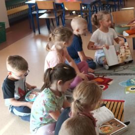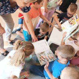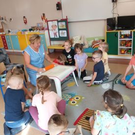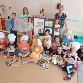 We wrześniu przedszkolaki poznały zawód kucharza, do grupy zaprosiliśmy panią Dorotkę -szefową naszej przedszkolnej kuchni. Sówki dowiedziały się jakie przedmioty są potrzebne w pracy kucharza, rozmawiały na temat przygotowywania posiłków, opowiadały o swoich ulubionych potrawach. Podczas zajęć dzieci oglądały książki kucharskie, pani kucharka wyjaśniła dzieciom co to jest przepis.