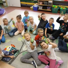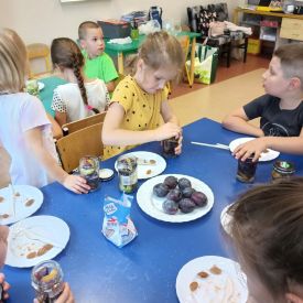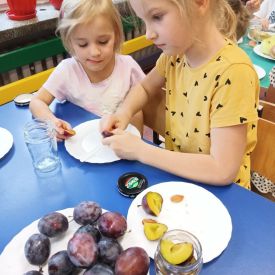 Zadaniem na miesiąc październiki były „Przetwory na zimowe wieczory”. Nasze przedszkolaki wykonały zadanie wzorowo, gdyż oprócz wykonania kompotów ze śliwek, jabłek i gruszek zakisiły również ogórki. Podczas zajęć dzieci w praktyczny sposób poznały kolejność wykonywanych czynności. Samodzielnie kroiły owoce, wkładały je do słoików, dodawały cukier i przyprawy potrzebne do kiszenia, po zalaniu słoików przygotowaną wodą zakręcały słoiki. Kompoty zostały poddane pasteryzacji. Na słoiki zostały naklejone odpowiednie naklejki.