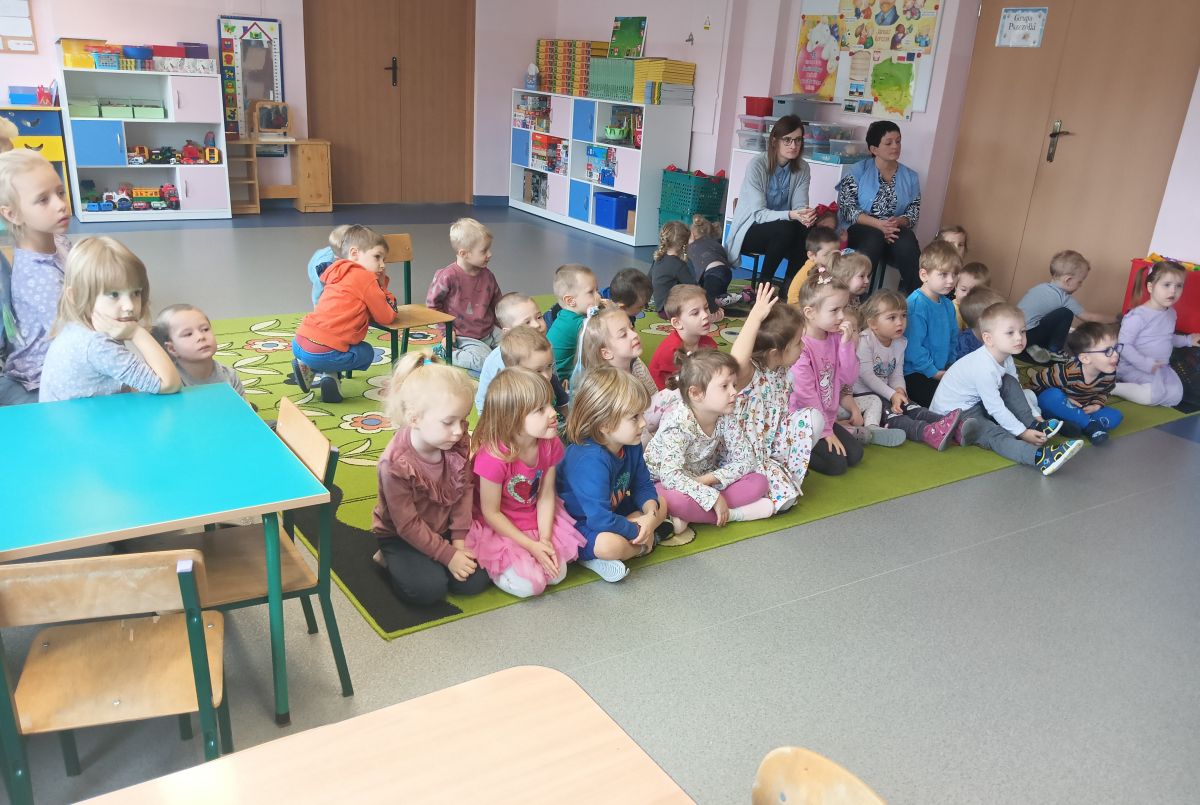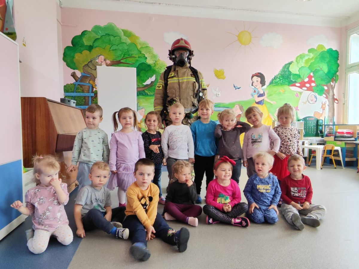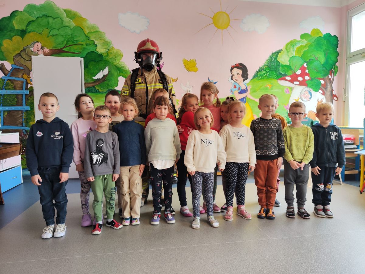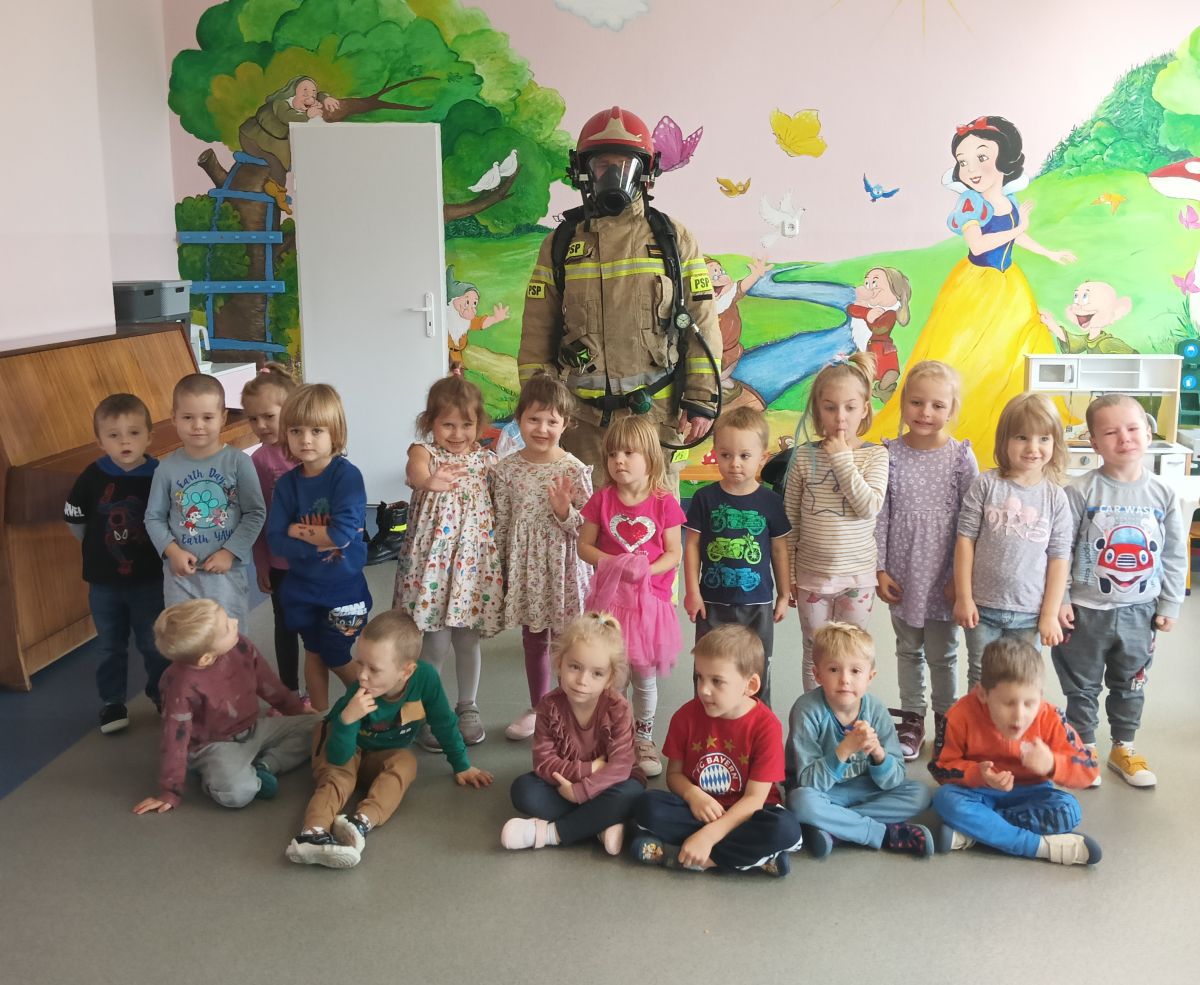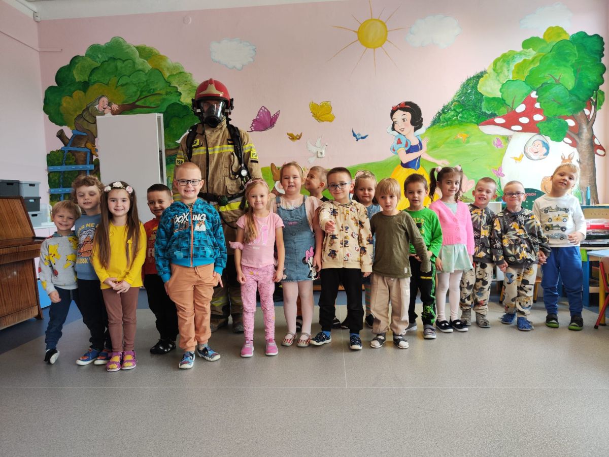 W dniu 16.11.2023 r. nasze przedszkole odwiedzili strażacy z Komendy Miejskiej Państwowej Straży Pożarnej w Kielcach. Niecodziennych gości na początku spotkania powitała pani dyrektor. Przedszkolaki z zachwytem i wielkim zaciekawieniem uczestniczyli w spotkaniu, podczas którego mogły poznać specyfikę pracy strażaków, umundurowanie strażackie oraz niektóre sprzęty jakimi dysponują. Dzieci dowiedziały się, że strażacy nie tylko gaszą pożary, ale również są wzywani do wypadków samochodowych, do zalanych domów, powalonych drzew, a także ratują zwierzęta.