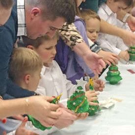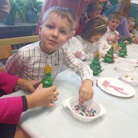 Uwieńczeniem spotkania były warsztaty plastyczne z Rodzicami, gdzie dzieci wspólnie z mamą i tatą ozdabiali cekinami, perełkami choineczki. Pracę uprzyjemniały słuchane kolędy.