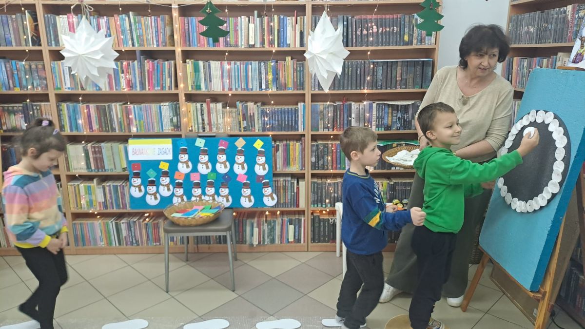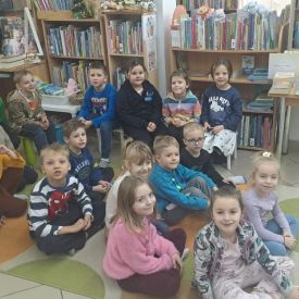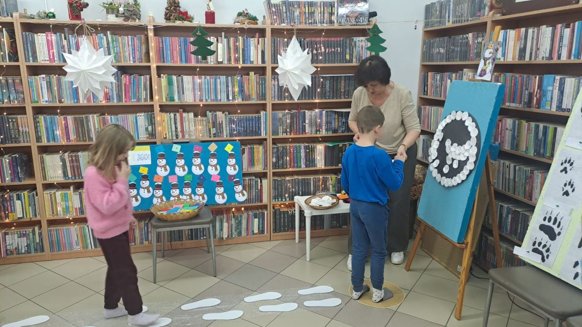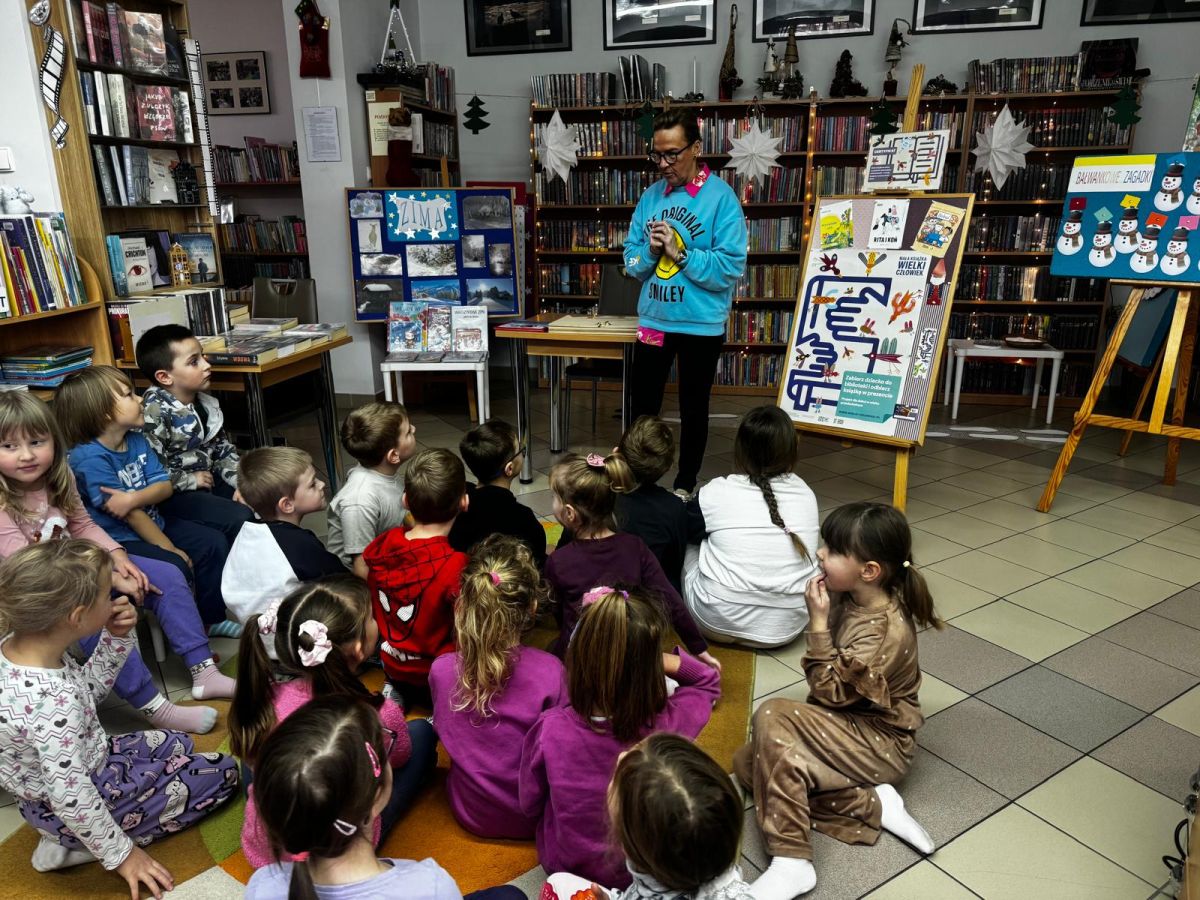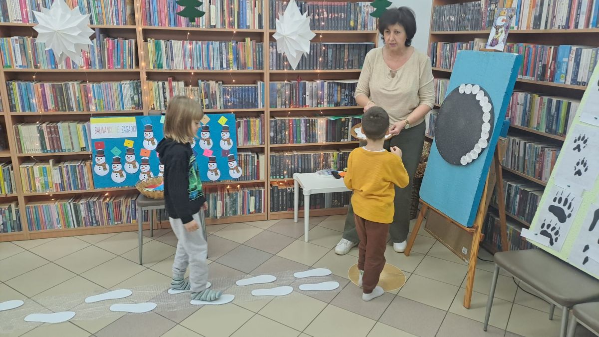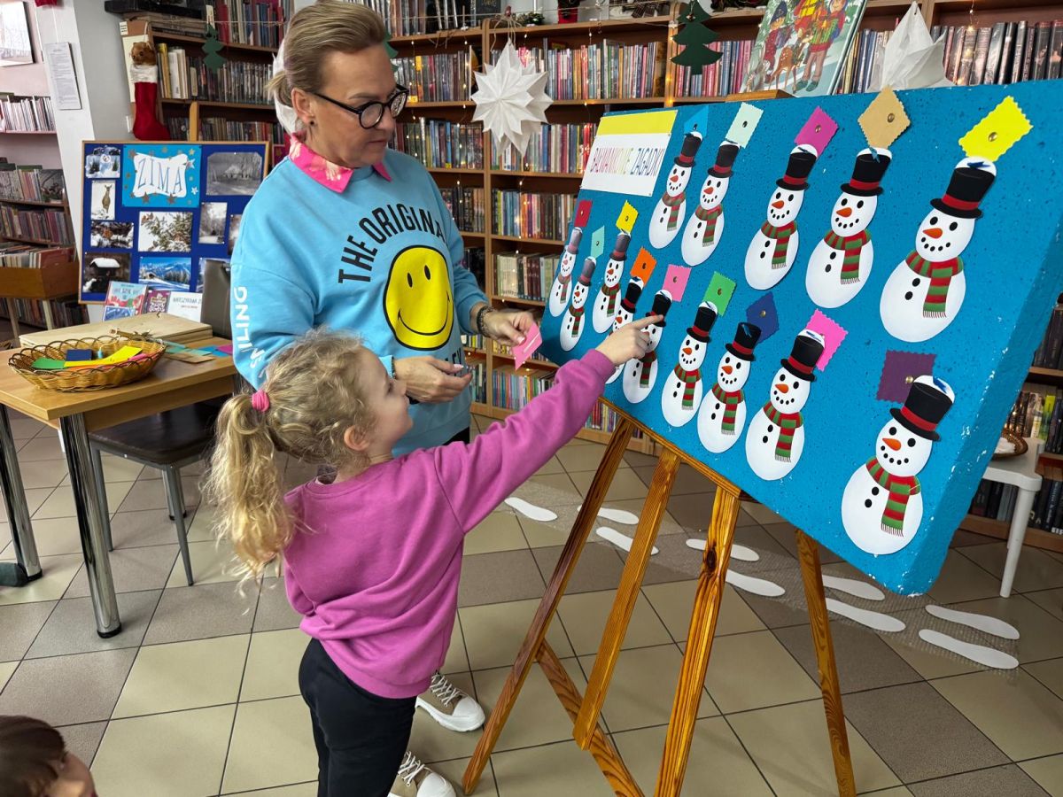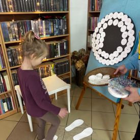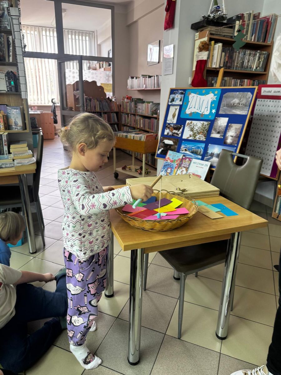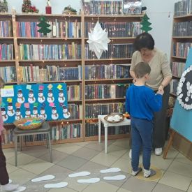 Przedszkolaki z grupy Sówek i Pszczółek uczestniczyły w zajęciach bibliotecznych o tematyce zimowej w Miejskiej Bibliotece Publicznej Filia nr 2 w Kielcach. Z uwagą wysłuchały opowiadania „Zima w lesie” czytanego przez panie bibliotekarki. Następnie brały udział w zabawach: rozpoznawały ślady zwierząt leśnych, znajdywały i odczytywały wyrazy na tablicy związane tematycznie z zimą. Najwięcej radości sprawiło dzieciom układanie sylwety głowy bałwanka z płatków kosmetycznych i z przysłoniętymi oczami przypinanie bałwankowi elementów. Po zajęciach przedszkolaki z zainteresowaniem oglądały księgozbiór dla dzieci.