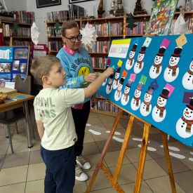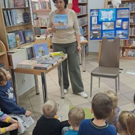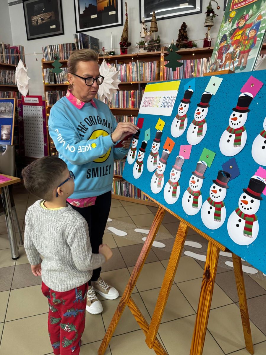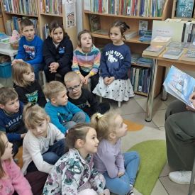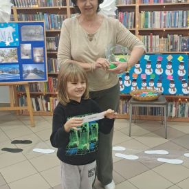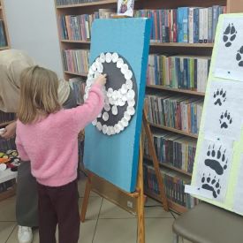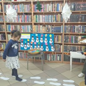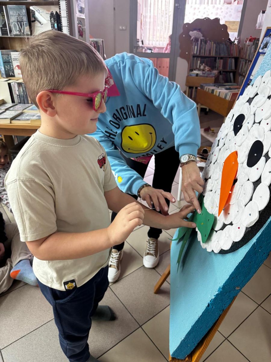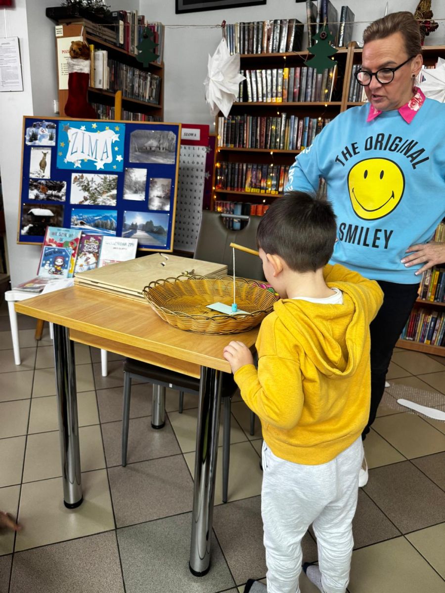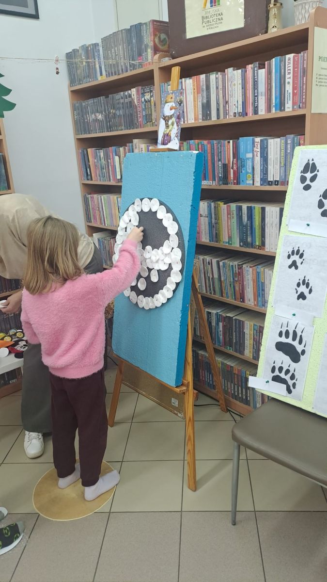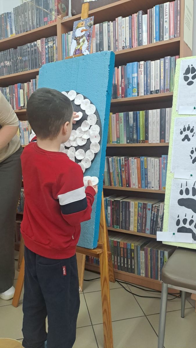 Przedszkolaki z grupy Sówek i Pszczółek uczestniczyły w zajęciach bibliotecznych o tematyce zimowej w Miejskiej Bibliotece Publicznej Filia nr 2 w Kielcach. Z uwagą wysłuchały opowiadania „Zima w lesie” czytanego przez panie bibliotekarki. Następnie brały udział w zabawach: rozpoznawały ślady zwierząt leśnych, znajdywały i odczytywały wyrazy na tablicy związane tematycznie z zimą. Najwięcej radości sprawiło dzieciom układanie sylwety głowy bałwanka z płatków kosmetycznych i z przysłoniętymi oczami przypinanie bałwankowi elementów. Po zajęciach przedszkolaki z zainteresowaniem oglądały księgozbiór dla dzieci.