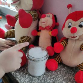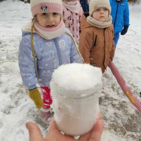 Biedronki podczas spaceru badały również właściwości śniegu wieloma zmysłami m.in.: wzrokiem, dotykiem, węchem. Na koniec spaceru przedszkolaki nabrały śniegu do słoika, by móc obserwować topnienie śniegu w sali.