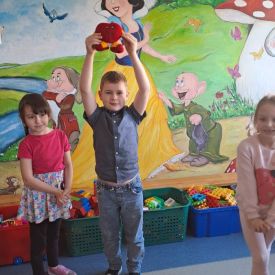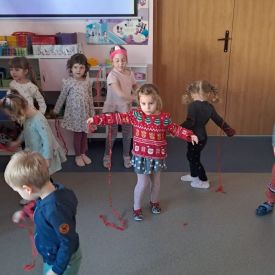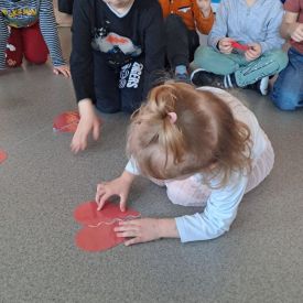 Nie zabrakło też radosnych zabaw w parach przy piosenkach z dawnych lat „Serduszko puka w rytmie cza - cza”, czy nowoczesnych rytmach „Chodzę ci znów Tobie po głowie”. Wspólnie zaśpiewały piosenkę ,,Walentynki dla chłopczyka i dziewczynki” z wykorzystaniem czerwonych serduszek. Zabawy tego dnia były odzwierciedleniem takich wartości jak: szczęście, miłość, przyjaźń i radość z przebywania ze sobą.