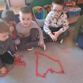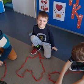 Dzieci obejrzały film edukacyjny ,,Kazio i Walentynki”, z którego dowiedziały się kim był św. Walenty , poznały tradycję obchodzenia tego święta w Polsce i innych krajach. Przedszkolaki uczestniczyły w różnych zabawach m.in. ,,Mam serduszko, wielkie serce”, "Odszukaj drugą połówkę”, ,,Tańczące balony”, układały kształt serca z pasków bibuły.
