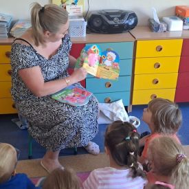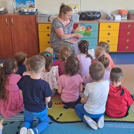 Dnia 17.05.2024 r. grupę Żabek po raz drugi odwiedziła pani Katarzyna- mama Igi, która przeczytała przedszkolakom książki z serii Zwierzęta wiejskie: „Owieczka”, i „Świnka”. Również dzieci uwielbiają słuchać bajek o Kici Koci i pani Kasia spełniła ich życzenie. Spotkanie dało wiele radości dzieciom.