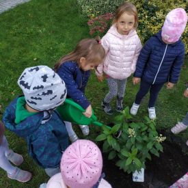 Nasz ogród przedszkolny został wzbogacony w piękne drzewo - catalpę oraz krzew - hortensję bukietową.