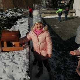 Przedszkolaki z Przedszkola Samorządowego nr 14 w trudnych, zimowych warunkach pamiętają o skrzydlatych przyjaciołach.