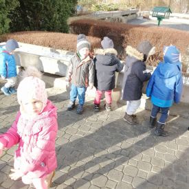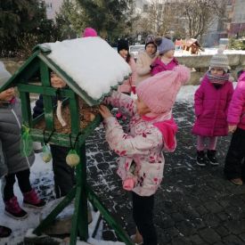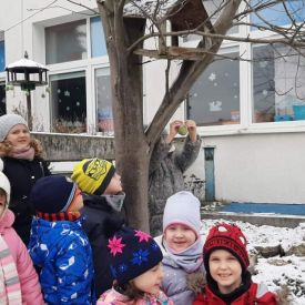 Każda grupa odwiedzała ptasie stołówki umieszczone na terenie naszego ogrodu przedszkolnego i zanosiła tam ptasie smakołyki.