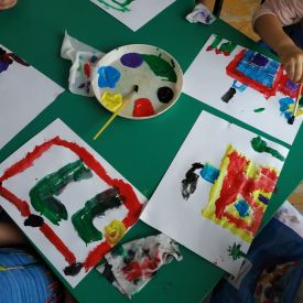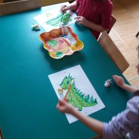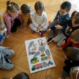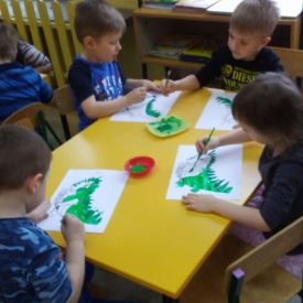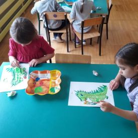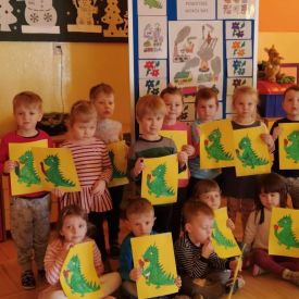 Przeprowadzonym zajęciom towarzyszyła sylweta dinozaura Dinusia, o którym dzieci nauczyły się piosenki. Poznały historię Dinusia, który wybrał się na wycieczkę pociągiem i przebywał w zadymionym wagonie. Malowały postać Dinusia, żródła dymów, wyklejały kwiaty, poznały znak "zakaz palenia" oraz wykonały własne znaczki ,,Bardzo proszę. Nie pal przy mnie!” .
