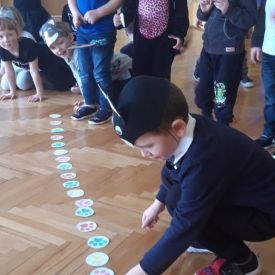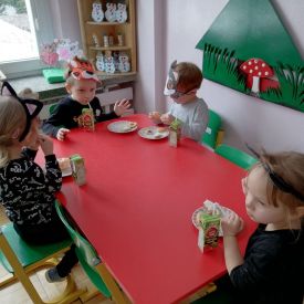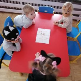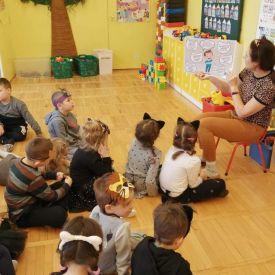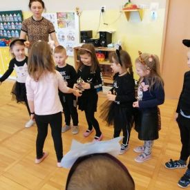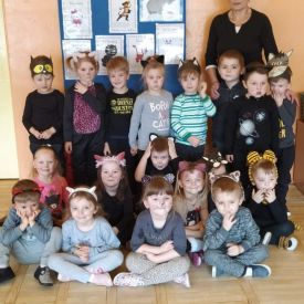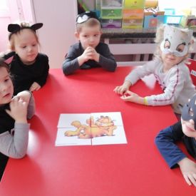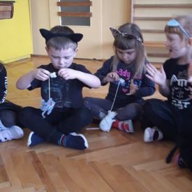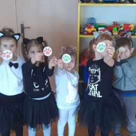 Od samego rana panowała radosna atmosfera. Na twarzach dzieci wymalowane były czarne noski i wąsiki oraz typowe dla kotka uszka. Uroczystość rozpoczęła się od prezentacji multimedialnej pt. ,,Kot i kocięta”. Czas umilały nam wspólne kocie zabawy przy muzyce np.: ,,Łakome kotki”, ,,Koty do koszyka”. Nie zabrakło też zagadek o naszych czworonożnych przyjaciołach „Z jakiej bajki ten kot?”