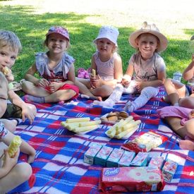 W piękny słoneczny dzień, dzieci z grupy BIEDRONECZEK, na kocach w cieniu drzew wzięły udział w pikniku zorganizowanym w ogrodzie przedszkolnym. Słodki poczęstunek uprzyjemnił im czas podczas upalnego dnia. Wspólne rozmowy i dzielenie się wrażeniami sprawiły dzieciom wiele radości. Jak tylko nieco podrosną, to tak jak ich starsi koledzy z przedszkola będą przemierzać leśne dróżki biorąc udział w przedszkolnych rajdach po okolicy.