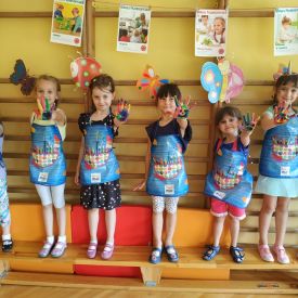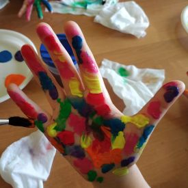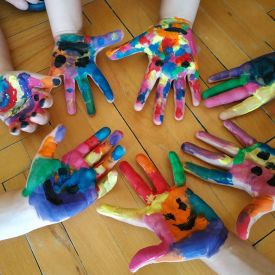 Dużo frajdy sprawiło dziewczynkom malowanie farbami swoich dłoni.