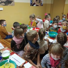 Zajęcia praktyczne z farbami, brokatem sprawiły wielką radość zarówno dziewczynkom, jak i chłopcom. Cała brygada w doskonałych humorach, pełna wrażeń wróciła bezpiecznie do przedszkola.