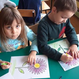 Na tych zajęciach dzieci poszerzyły wiedzę dotyczącą szkodliwości dymu papierosowego poprzez zabawę Kwiatki do muzyki relaksacyjnej. Odpowiadały na pytania: które zapachy były miłe, a które nieprzyjemne, jak zachowywały się kwiaty na łące, gdy ktoś palił papierosy? Podczas zabaw towarzyszył przedszkolakom wesoły dinozaur -Dinek ze swoją piosenką: „…Papieros to wróg nasz co zdrowie zabiera. Nie wolno! To szkodzi! Dość tego palenia!”