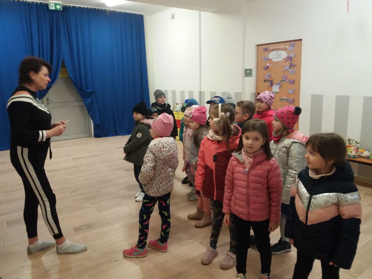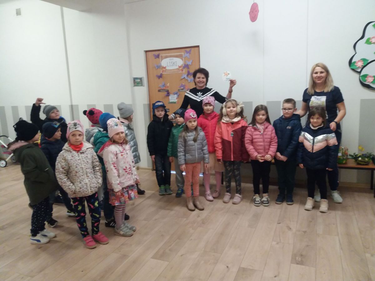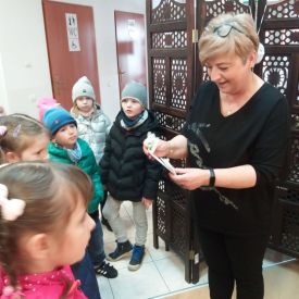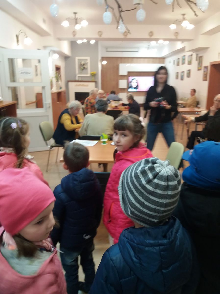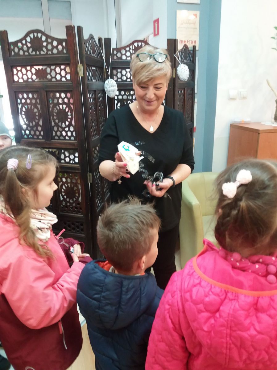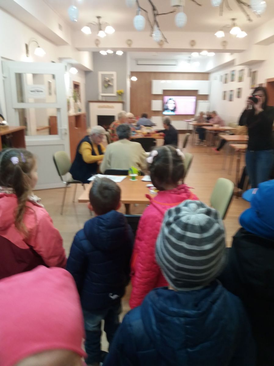 W przedświąteczny wtorek dzieci z grupy Sówek odwiedziły zaprzyjaźnione placówki na naszym osiedlu. Były to Miejska Biblioteka Publiczna Filia nr 2 ,Oddziały Przedszkole przy Szkole Podstawowej Nr 31 z Oddziałami Integracyjnymi im. Henryka Sienkiewicza oraz Środowiskowy Dom Samopomocy typu C. Wszystkie te placówki mieszczą się przy ul. Krzemionkowej 1 w Kielcach. Wraz z nauczycielem przedszkolaki złożyły wielkanocne życzenia oraz wręczyły kartki świąteczne. Była to niezapowiedziana wizyta, więc tym bardziej zaskoczyła i ucieszyła odwiedzonych. W podziękowaniu dzieci otrzymały słodycze oraz piękny koszyczek wielkanocny.