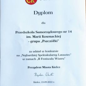 23 września na kieleckim Rynku odbył się finał Festiwalu Wiatru. Nasze Przedszkolaki z grupy Pszczółek i Sówek zajęły ex aequo III miejsce za przepiękne latawce przedstawiające bociana i świętokrzyską Babę-Jagę.