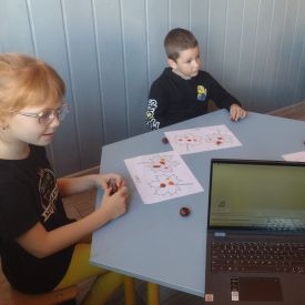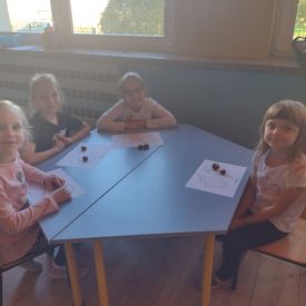 Podczas słuchania kompozycji Abla Korzeniowskiego pt.„Swimming” przedszkolaki naśladowały ruchem jesienny wiatr, rytm spadających z drzew kasztanów oraz ich dźwięk podczas turlania.