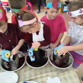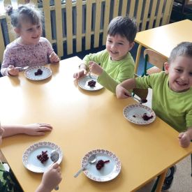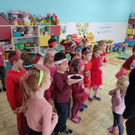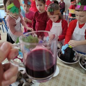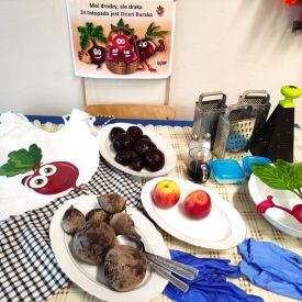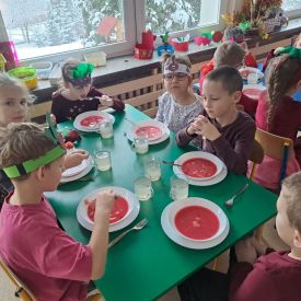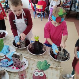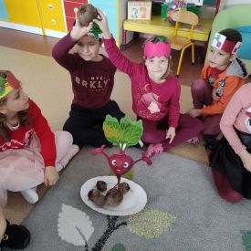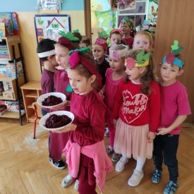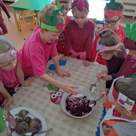 Podsumowaniem "buraczanych zajęć' było wykonanie surówki z buraka. Wszystkie dzieci z wielką ochotą pomagały w tarciu buraka i jabłek. Po wykonaniu sałatki przyszedł czas na poczęstunek całej społeczności przedszkolnej i degustację. Surówka wszystkim smakowała a dopełnieniem Dnia Buraka była zupa - czerwony barszcz ukraiński - przygotowany przez nasze wspaniałe Panie kucharki.