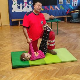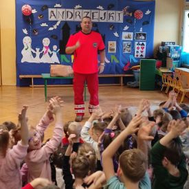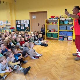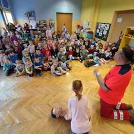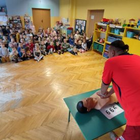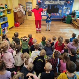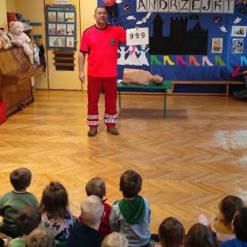 Podczas spotkania przedszkolaki zetknęły się oko w oko z tematem pierwszej pomocy przedstawionej w lekkiej i łatwo przyswajalnej formie. Ratownik medyczny - główny bohater przedstawienia - wprowadził dzieci w tajniki pierwszej pomocy przedmedycznej. Maluchy przypomniały i utrwaliły sobie numery telefonów alarmowych oraz podstawowe i najważniejsze czynności związanych z ratownictwem. Dużym zainteresowaniem cieszył się fantom do nauki resuscytacji. Mamy nadzieję, że dzieci z tego spotkania zapamiętały bardzo dużo i zdobyta wiedza utkwi w głowach na zawsze.