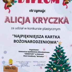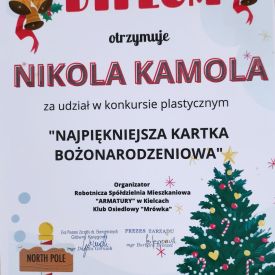 Miło nam poinformować, że nasze przedszkolaki zajęły czołowe miejsca w konkursie „NAJPIĘKNIEJSZA KARTKA BOŻONARODZENIOWA” organizowanym przez Robotniczą Spółdzielnię Mieszkaniową „Armatury” w Kielcach oraz Klub Osiedlowy ,.Mrówka”. Celem konkursu było podtrzymywanie tradycji bożonarodzeniowych, rozwijanie kreatywności, inspirowanie do pracy twórczej, rozwijanie wyobraźni dzieci. Nagrody i dyplomy w imieniu organizatorów w dniu 21 grudnia wręczyła naszym małym artystom Pani dyrektor - Renata Monika Jas. Kochane Przedszkolaki, drodzy Rodzice dziękujemy Wam za udział i promowanie naszego Przedszkola na terenie miasta.