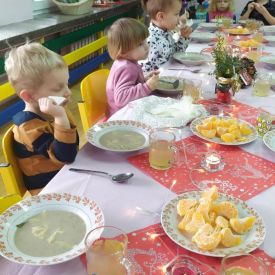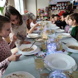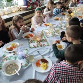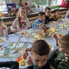 Wszyscy zgromadzeni na sali zostali zaproszeni do stajenki, by pokłonić się małemu Jezuskowi. Był czas na wspólne kolędowanie, składanie świątecznych życzeń oraz spożywanie posiłków przygotowanych przez nasze wspaniałe Panie kucharki.