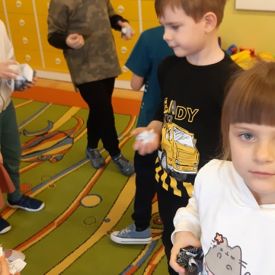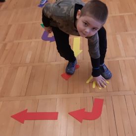 Zabawa oddechowa ,,Kolorowe kółeczka”, która była jednocześnie ćwiczeniem logopedycznym rozwijała koordynację ruchowo – wzrokową. Przy piosence ,,Taniec przyklejaniec” Pszczółki utrwaliły części ciała, a przy zabawie ,,Strzałka” kierunki.
