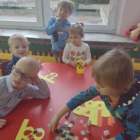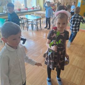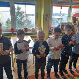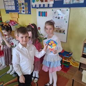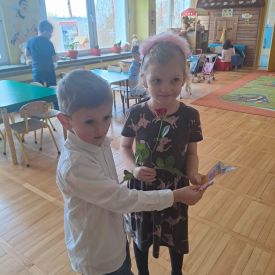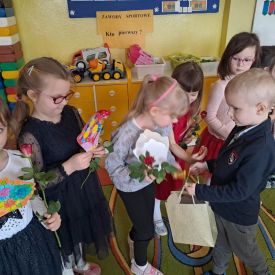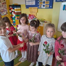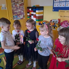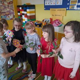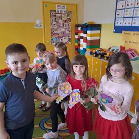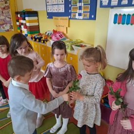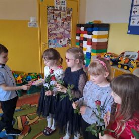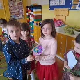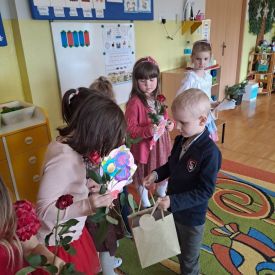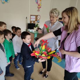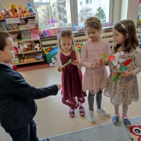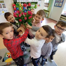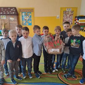 Chłopcy z wszystkich grup przygotowali dla Pań i koleżanek uroczysty poranek z okazji Dnia Kobiet. Żeby uświetnić ten dzień, chłopcy recytowali wiersz, zaśpiewali piosenkę, złożyli życzenia, zaśpiewali uroczyste „100 lat” oraz obdarowali wszystkie koleżanki i Panie pracujące w przedszkolu kwiatami, własnoręcznie wykonanymi laurkami i tulipanami. Jest to doskonały sposób do kształtowania u przedszkolaków nawyku obdarowywania upominkami swoich najbliższych. Uśmiechnięte buzie przedszkolaków a zwłaszcza dziewczynek świadczyły o miło spędzonym czasie.