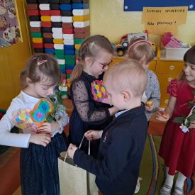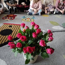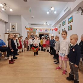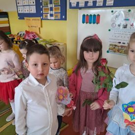 Tam przedszkolaki recytowały wiersz, śpiewały piosenki i tańczyły. Po części artystycznej chłopcy złożyli życzenia Paniom, zaśpiewali uroczyste „100 lat” i wręczyli kwiaty.