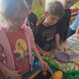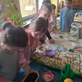 Wraz z przyjściem wiosny przedszkolaki w dniu 30.03.2023 r. założyły „Zielony ogródek”. Zgromadziły potrzebne nasionka, cebulki, doniczki, ziemię do sadzenia i konewkę do podlewania. Przed przystąpieniem do pracy poznały etapy sadzenia i siania roślin oraz warunki potrzebne do ich wzrostu.
