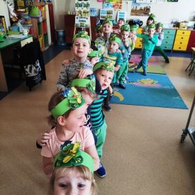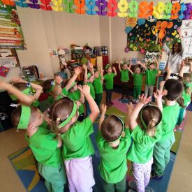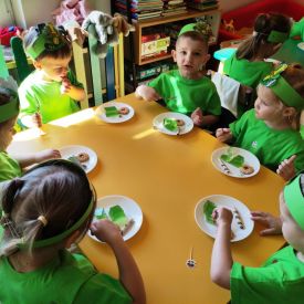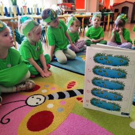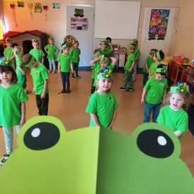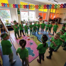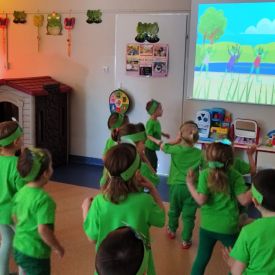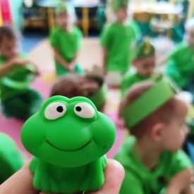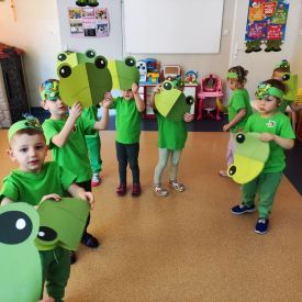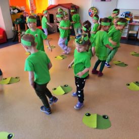 Dzieci z grupy Żabek 20 marca obchodziły Dzień Żaby. Podczas zajęć przedszkolaki zdobyły informacje na temat życia, budowy żab, roli jaką pełnią w przyrodzie, wysłuchały opowiadania B. Formy „Zielona żabka”. Następnie brały udział w wielu zabawach, gdzie główną bohaterką była zielona żabka. Dowiedziały się również jak brzmi słowo żaba w języku angielskim. Na zakończenie zajęć dzieci degustowały zieloną galaretkę, którą przygotowały dzień wcześniej.