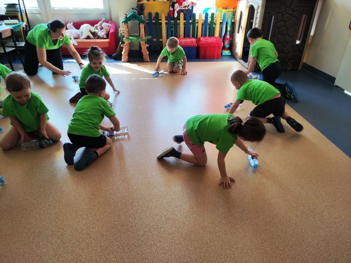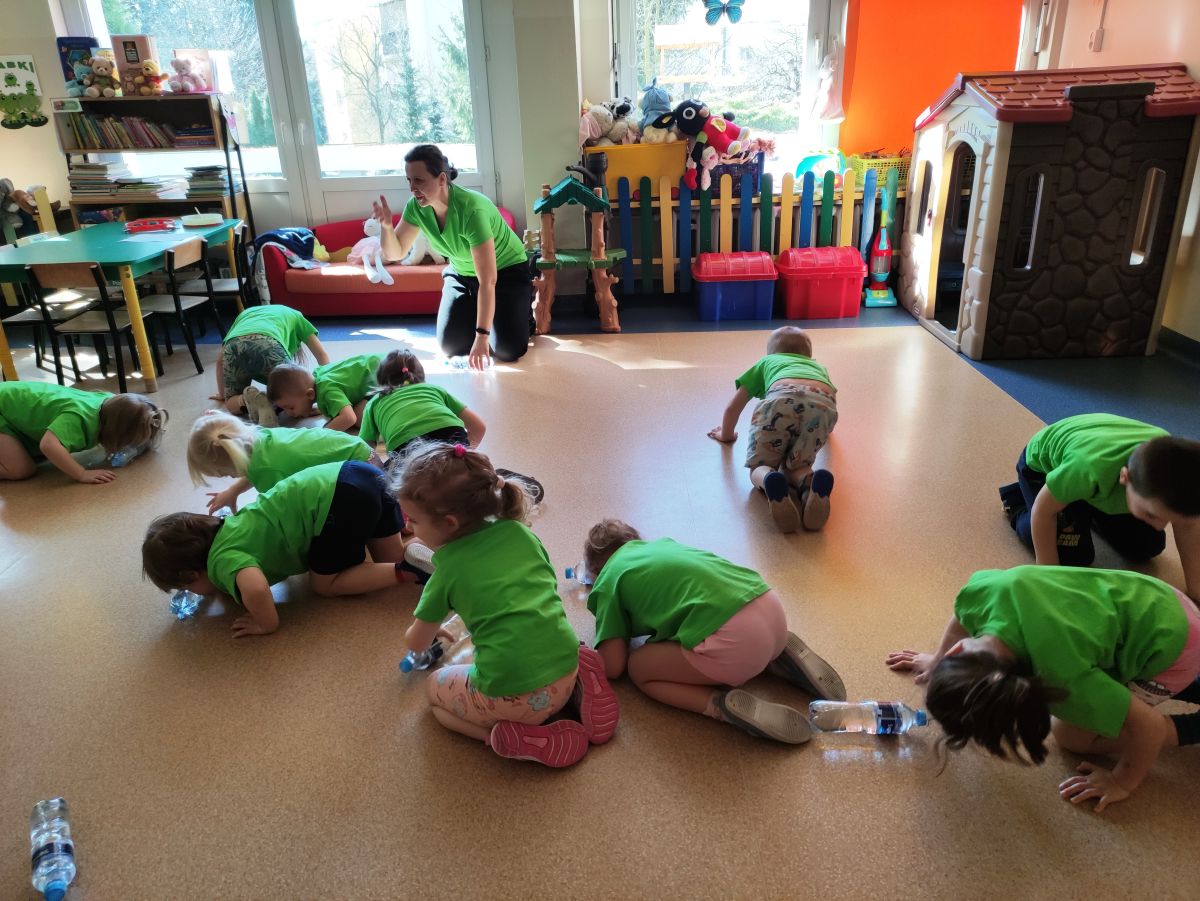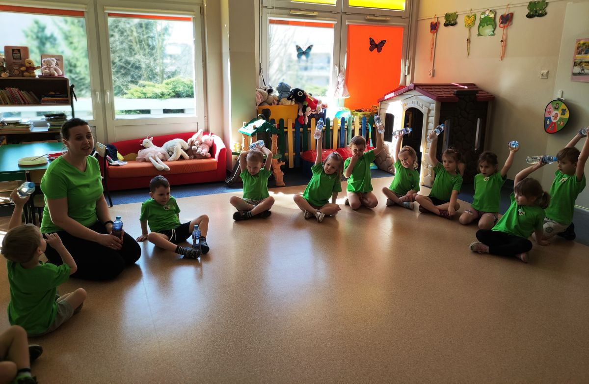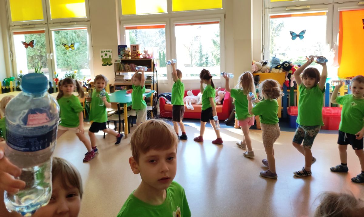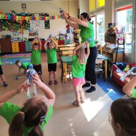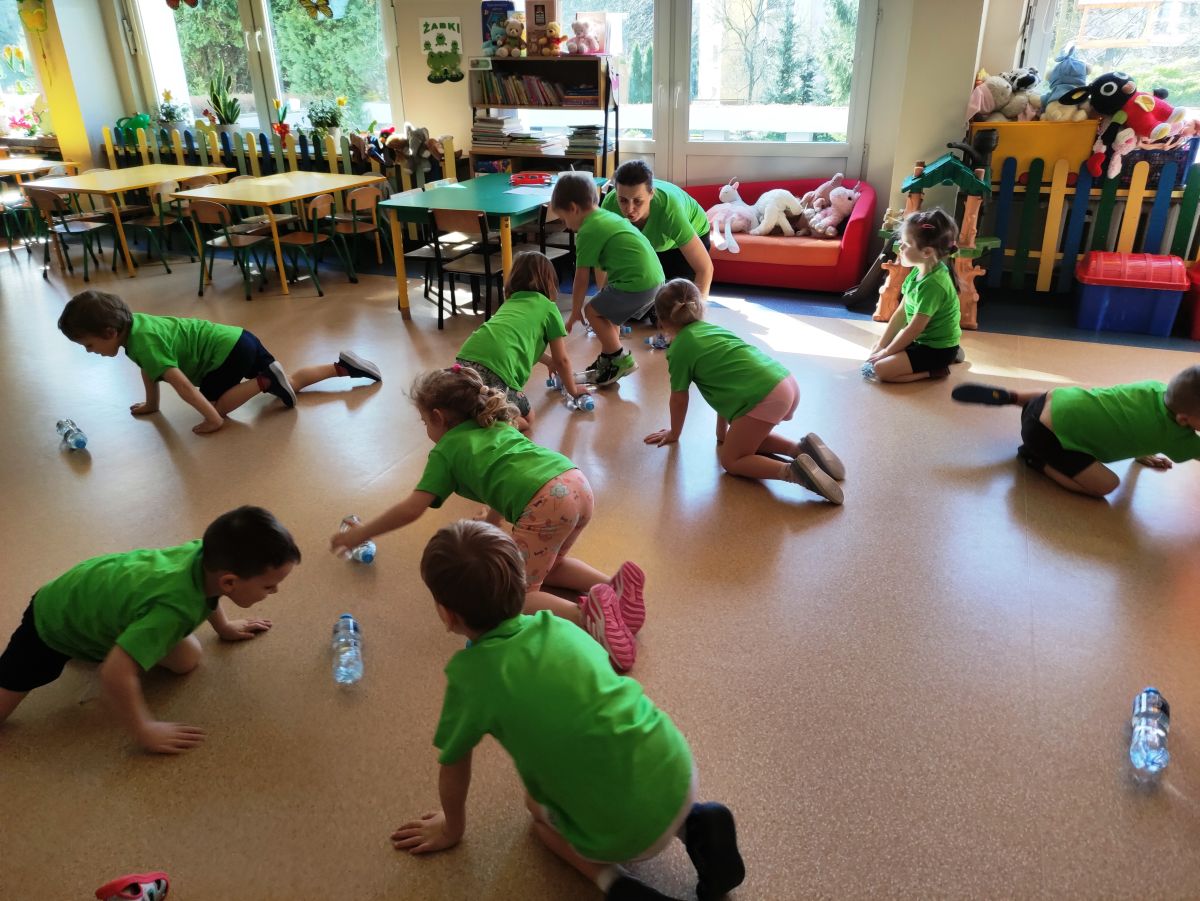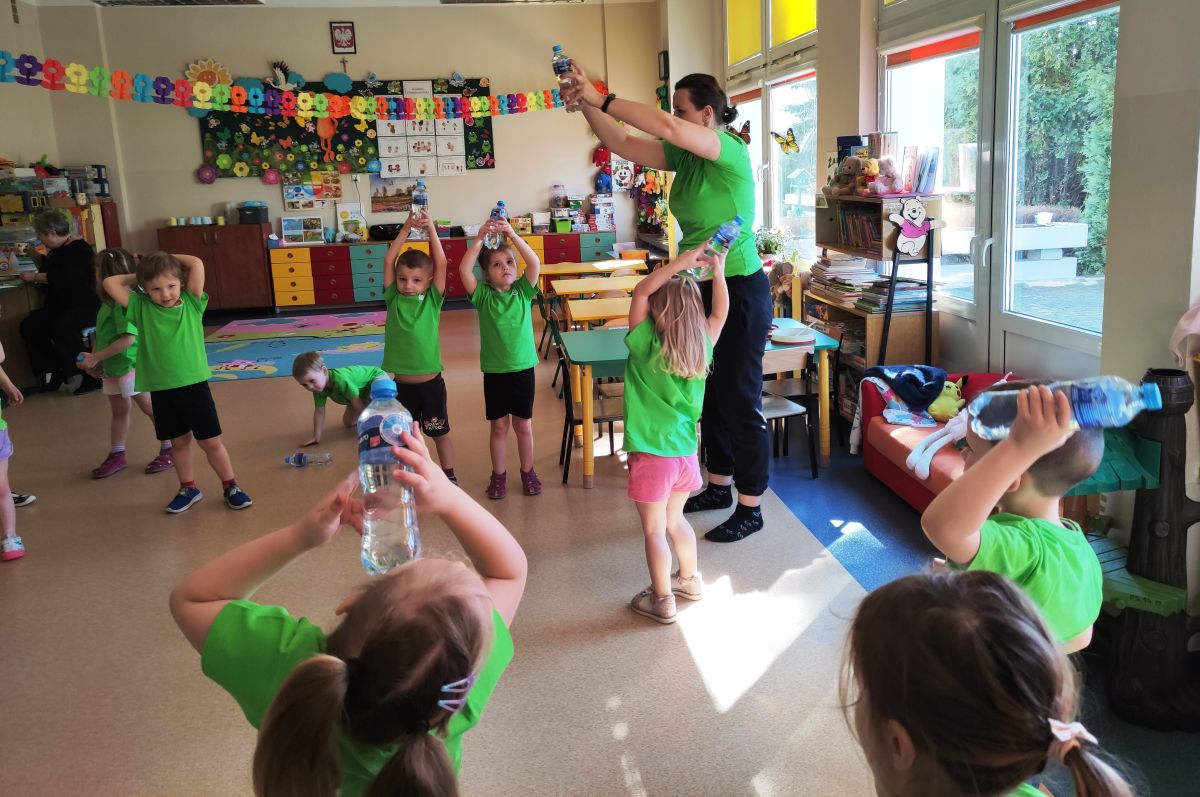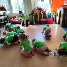 Dzieci z grupy Żabek rozwijały sprawność fizyczną poprzez zabawy ruchowe i ćwiczenia gimnastyczne z wykorzystaniem butelek z wodą mineralną. Zajęcia z nietypowymi przyborami sprawiły dzieciom dużo frajdy. Na zakończenie ćwiczeń dzieci piły wodę - najzdrowszy napój na naszej planecie. Choć samodzielne odkręcenie butelki nie było łatwym zadaniem. Udało się to tylko 3 dziewczynkom. Brawa dla Natalii, Neli oraz Róży. Pozostałe dzieci obiecały ćwiczyć tę umiejętność w domu.