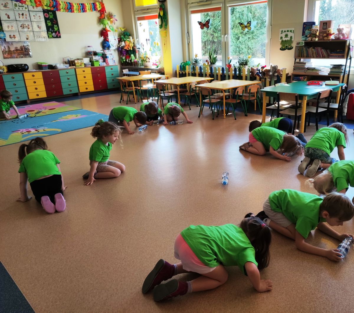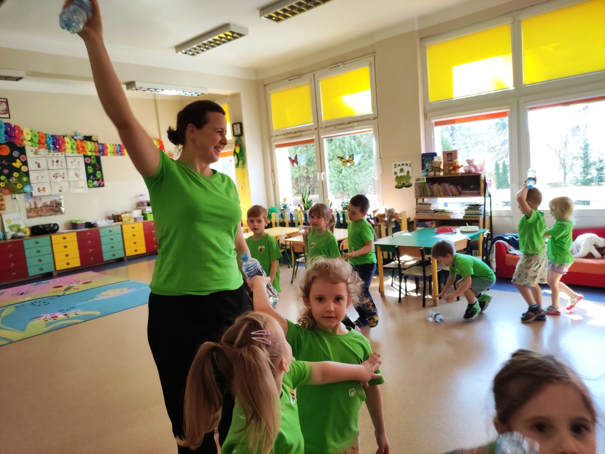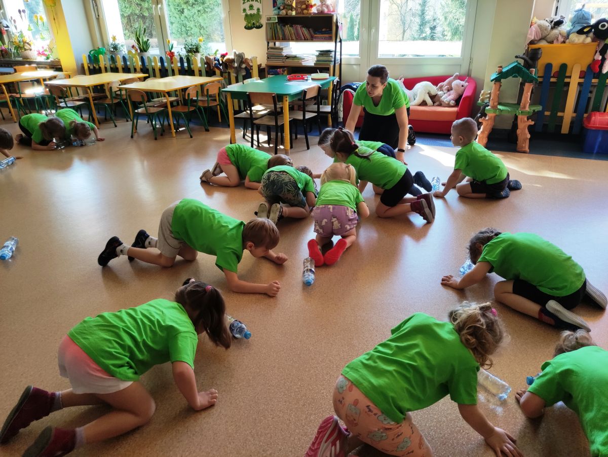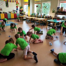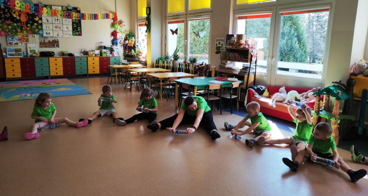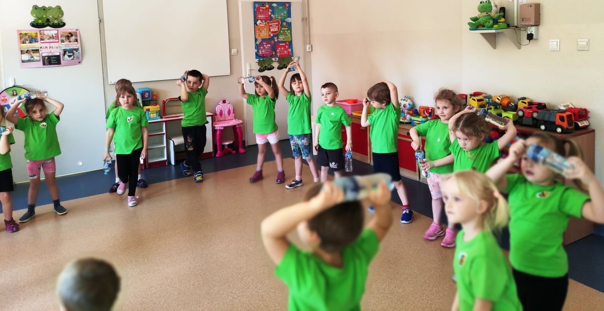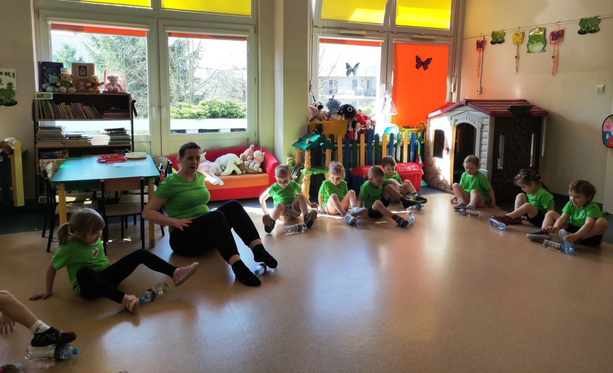 Dzieci z grupy Żabek rozwijały sprawność fizyczną poprzez zabawy ruchowe i ćwiczenia gimnastyczne z wykorzystaniem butelek z wodą mineralną. Zajęcia z nietypowymi przyborami sprawiły dzieciom dużo frajdy. Na zakończenie ćwiczeń dzieci piły wodę - najzdrowszy napój na naszej planecie. Choć samodzielne odkręcenie butelki nie było łatwym zadaniem. Udało się to tylko 3 dziewczynkom. Brawa dla Natalii, Neli oraz Róży. Pozostałe dzieci obiecały ćwiczyć tę umiejętność w domu.