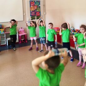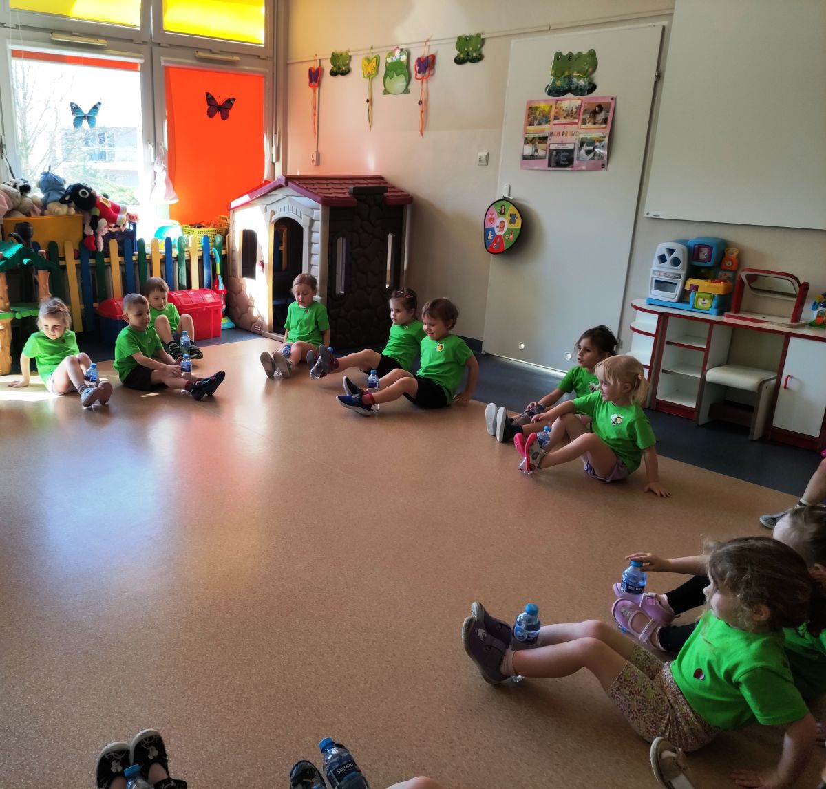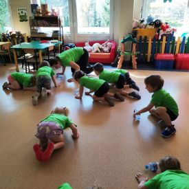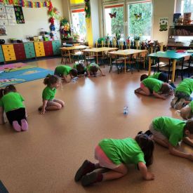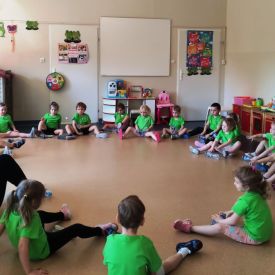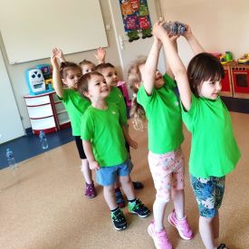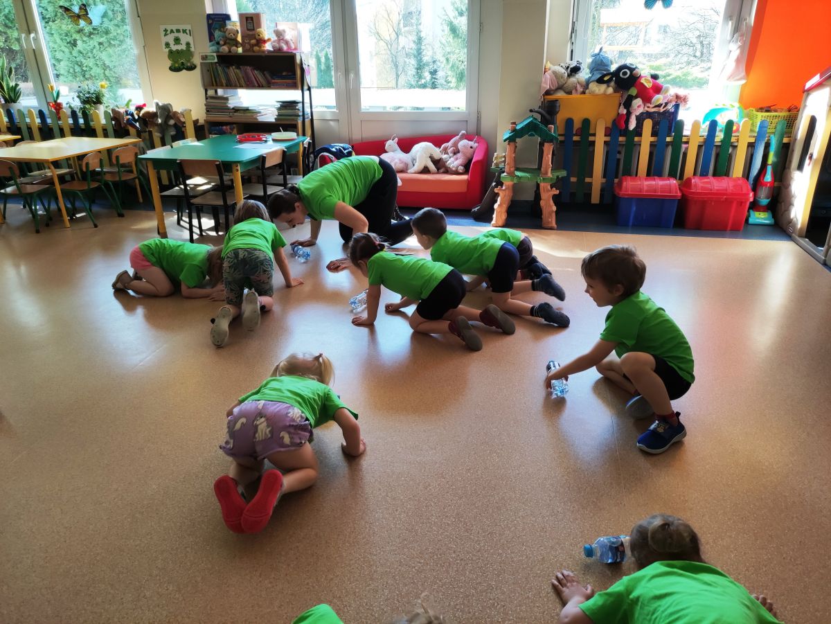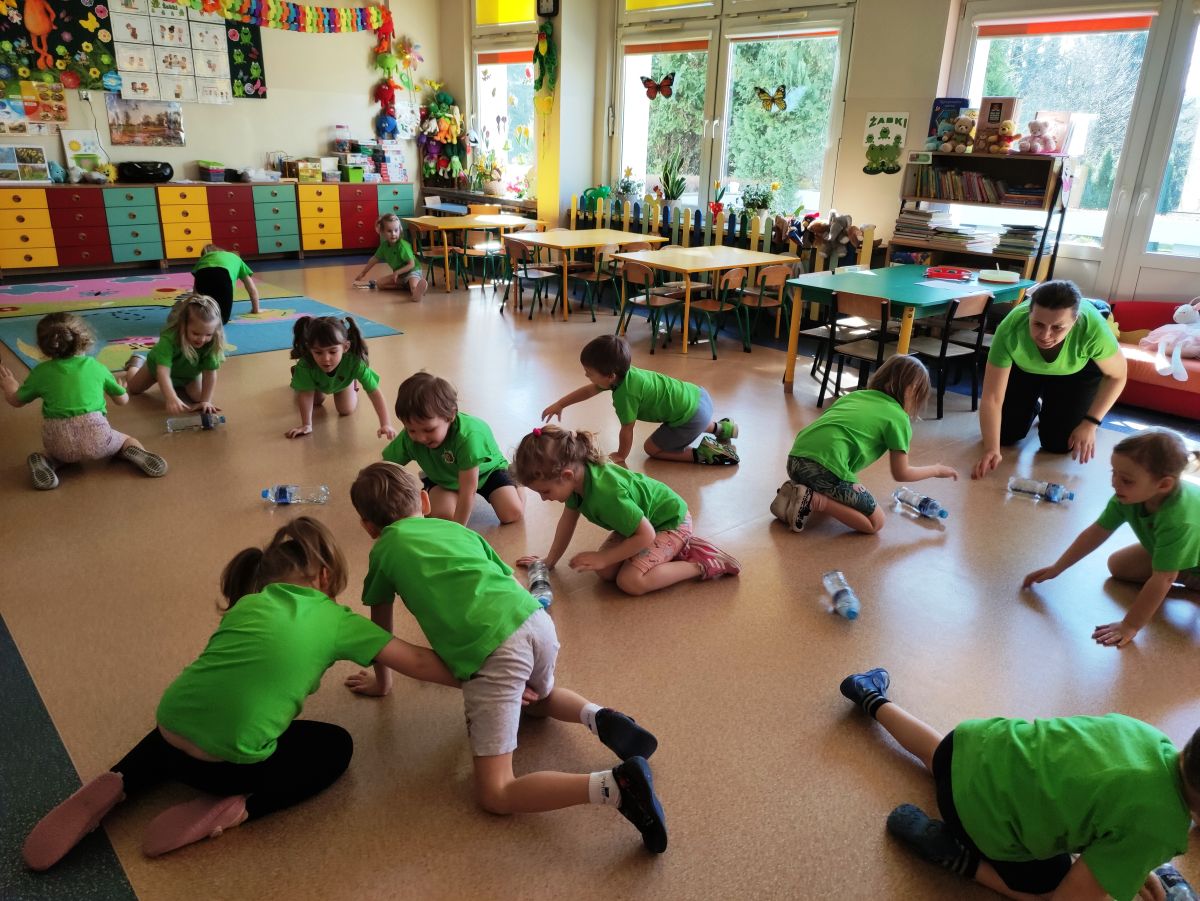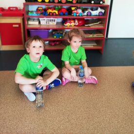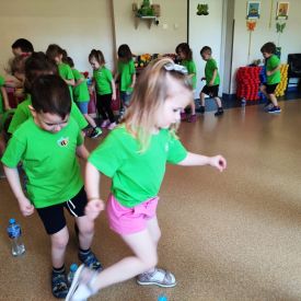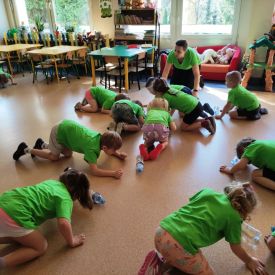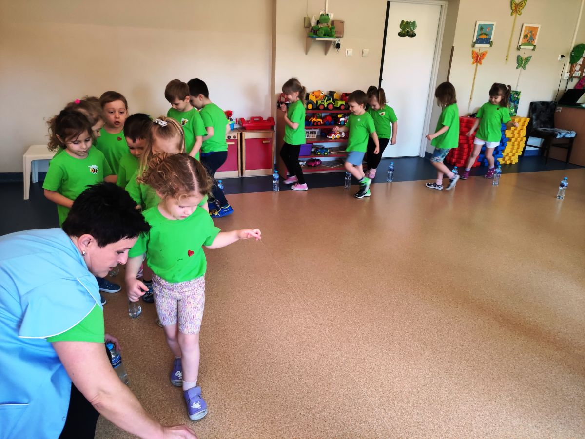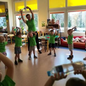 Dzieci z grupy Żabek rozwijały sprawność fizyczną poprzez zabawy ruchowe i ćwiczenia gimnastyczne z wykorzystaniem butelek z wodą mineralną. Zajęcia z nietypowymi przyborami sprawiły dzieciom dużo frajdy. Na zakończenie ćwiczeń dzieci piły wodę - najzdrowszy napój na naszej planecie. Choć samodzielne odkręcenie butelki nie było łatwym zadaniem. Udało się to tylko 3 dziewczynkom. Brawa dla Natalii, Neli oraz Róży. Pozostałe dzieci obiecały ćwiczyć tę umiejętność w domu.