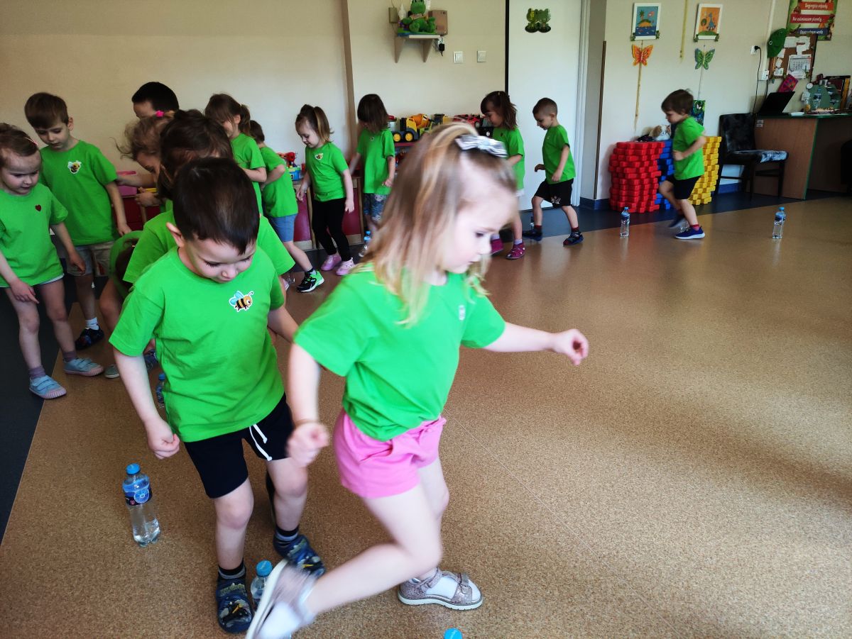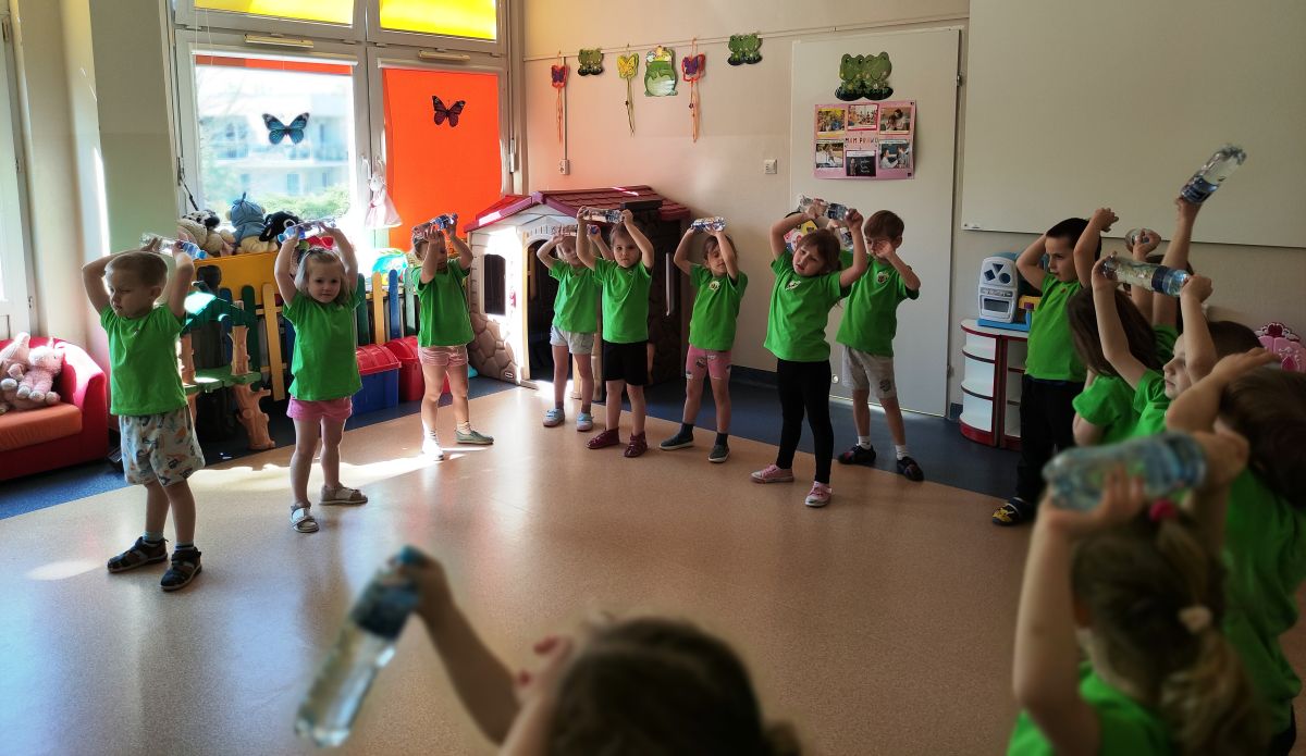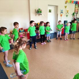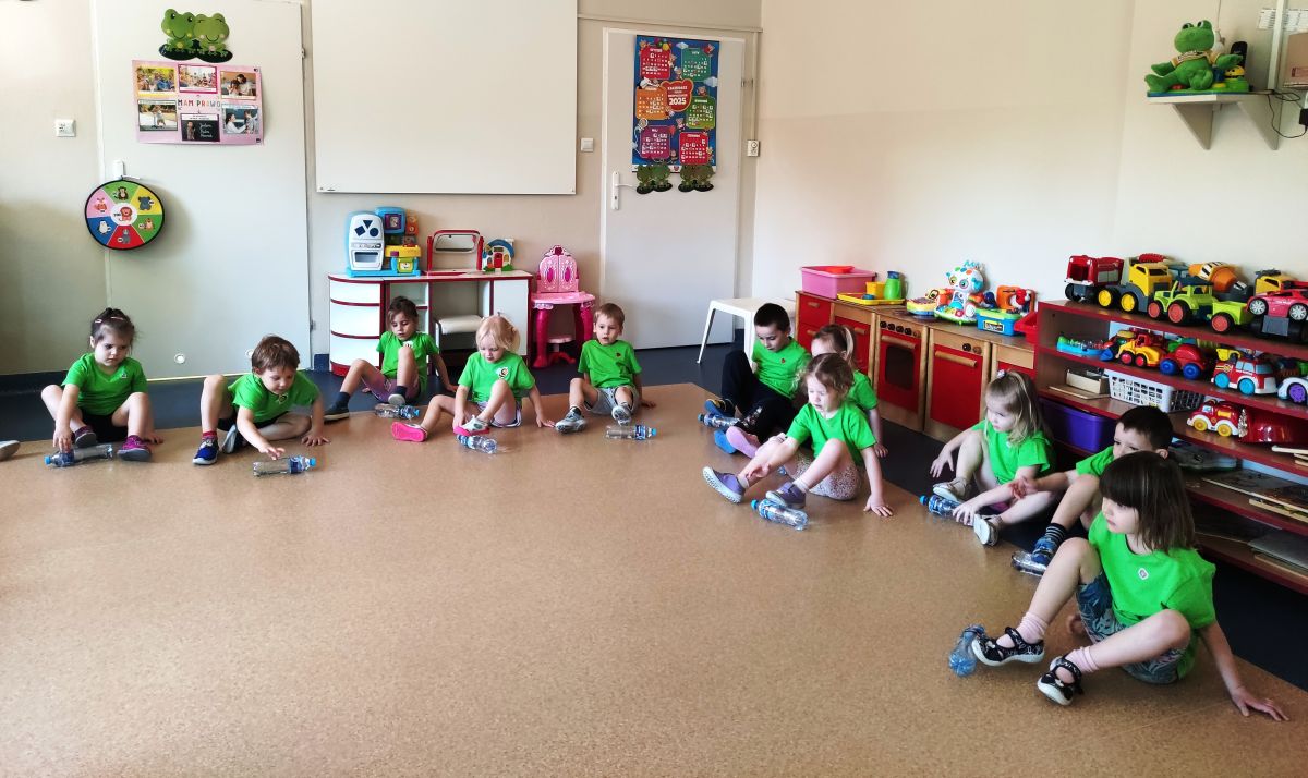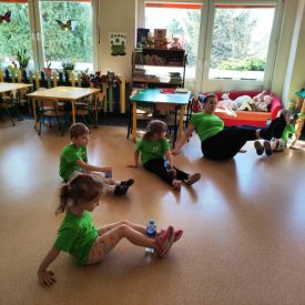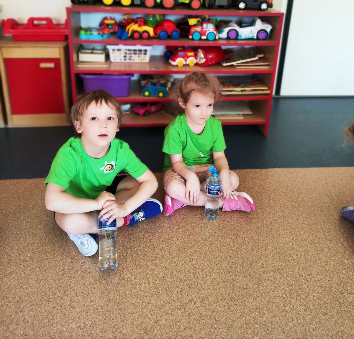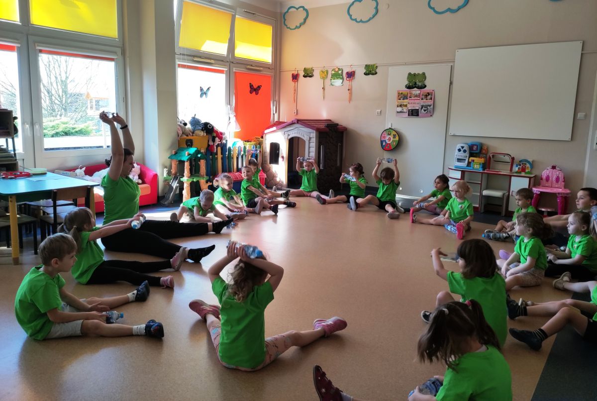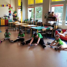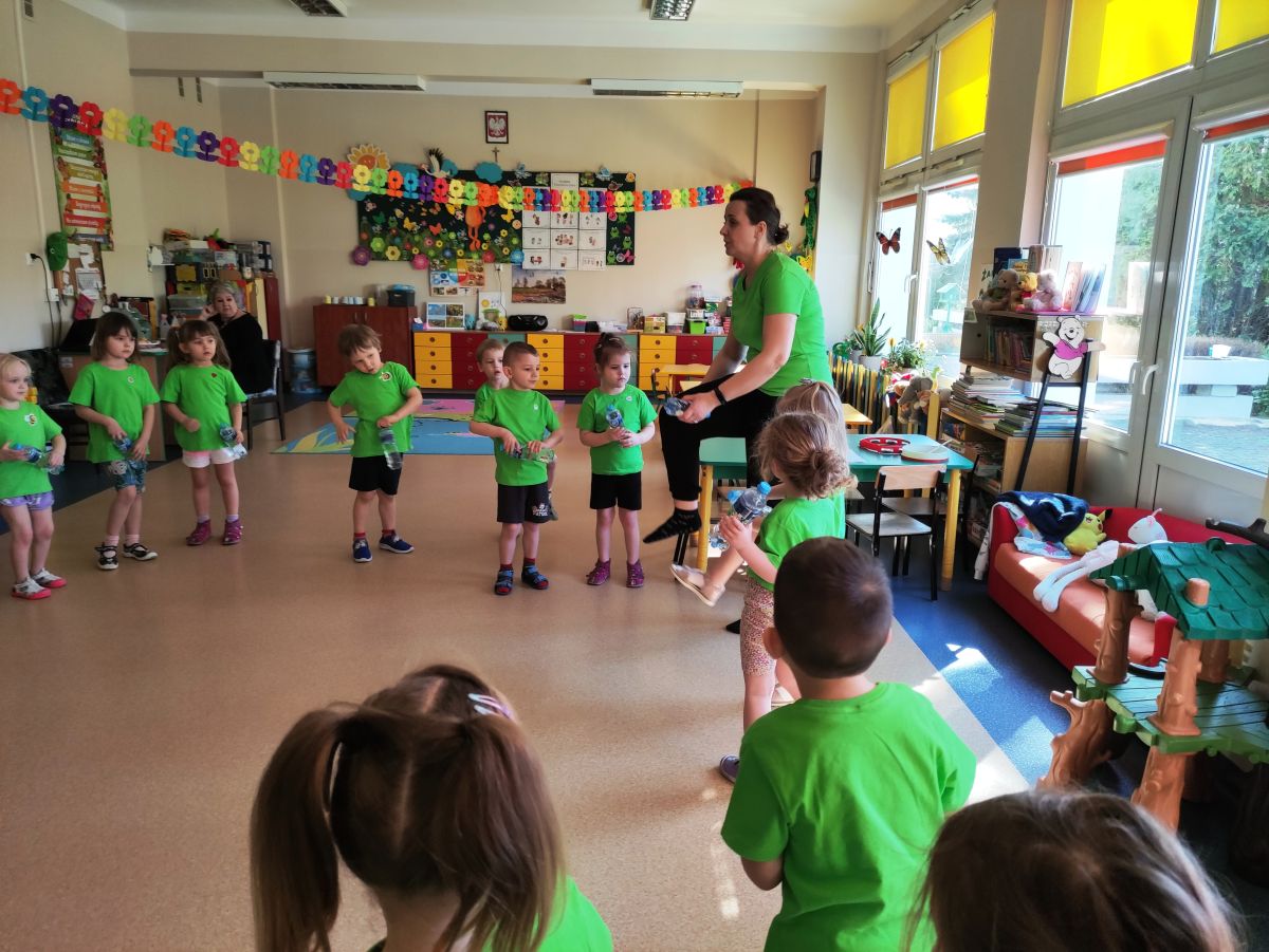 Dzieci z grupy Żabek rozwijały sprawność fizyczną poprzez zabawy ruchowe i ćwiczenia gimnastyczne z wykorzystaniem butelek z wodą mineralną. Zajęcia z nietypowymi przyborami sprawiły dzieciom dużo frajdy. Na zakończenie ćwiczeń dzieci piły wodę - najzdrowszy napój na naszej planecie. Choć samodzielne odkręcenie butelki nie było łatwym zadaniem. Udało się to tylko 3 dziewczynkom. Brawa dla Natalii, Neli oraz Róży. Pozostałe dzieci obiecały ćwiczyć tę umiejętność w domu.