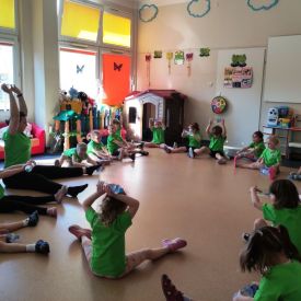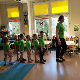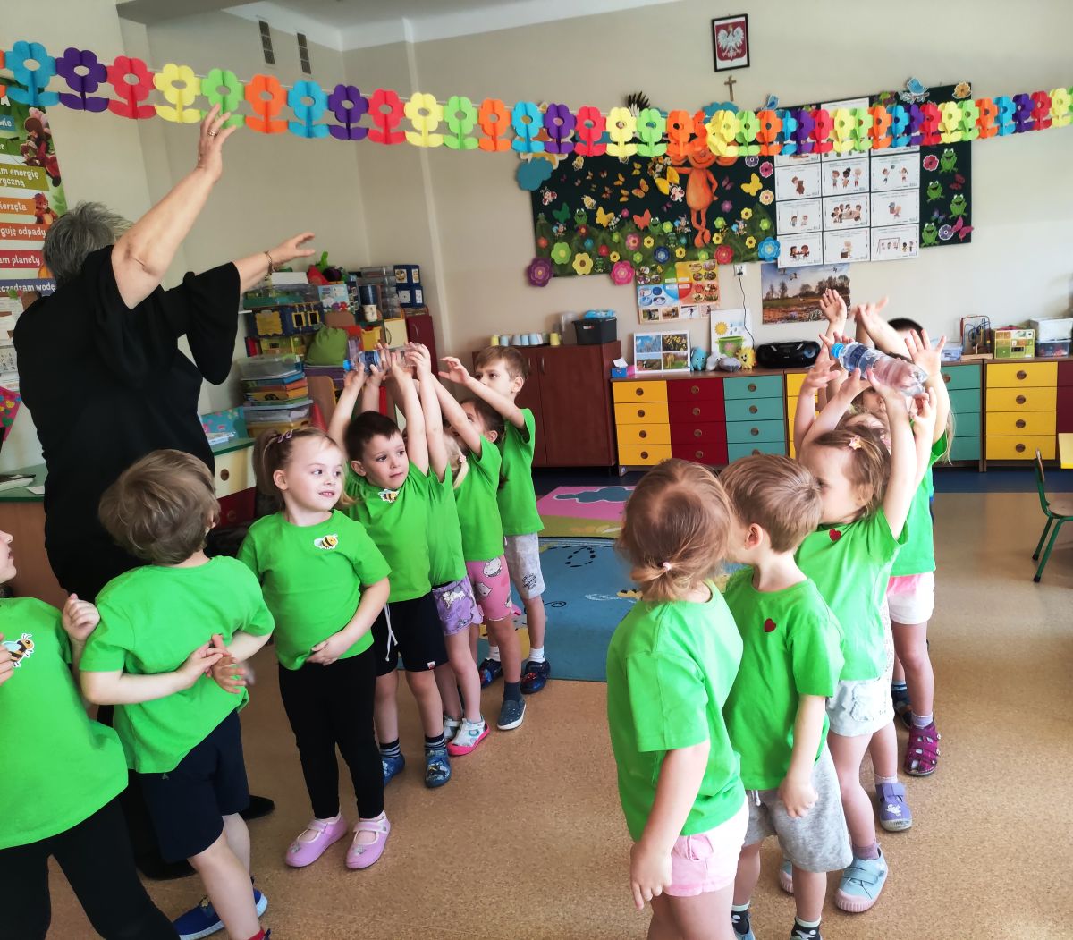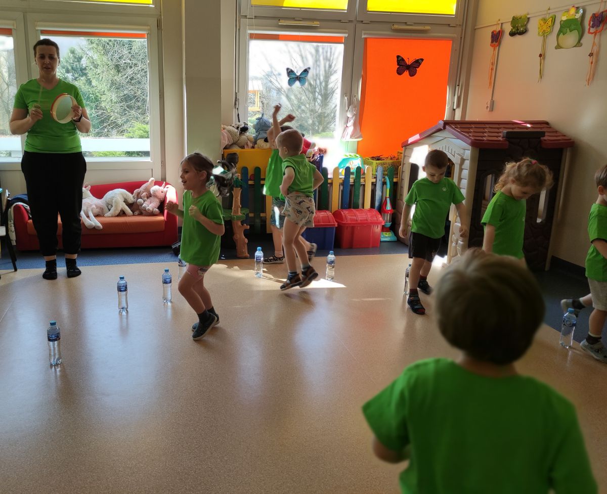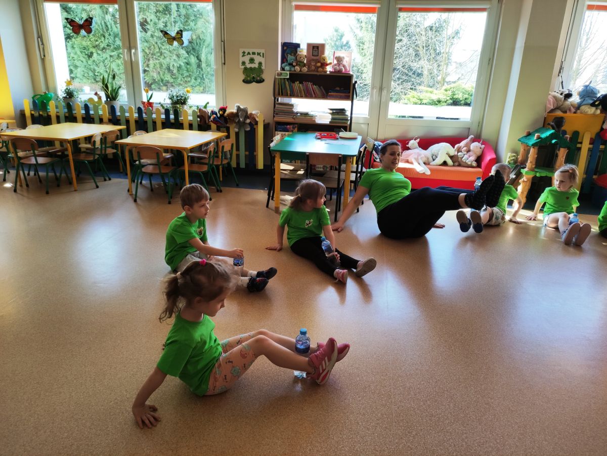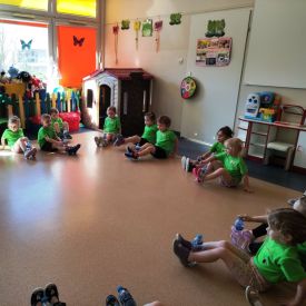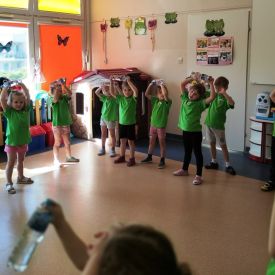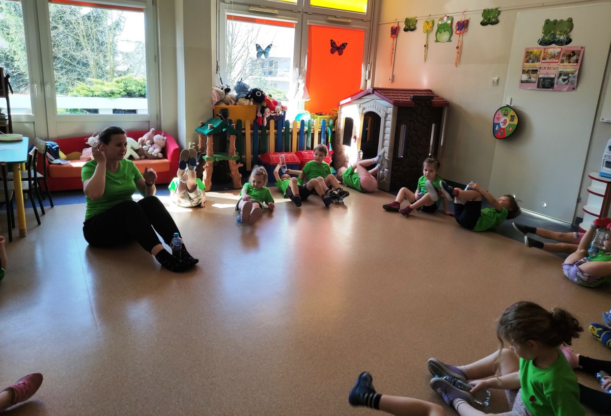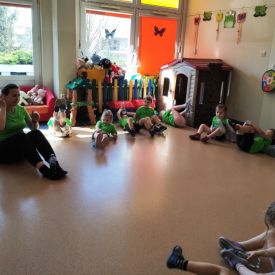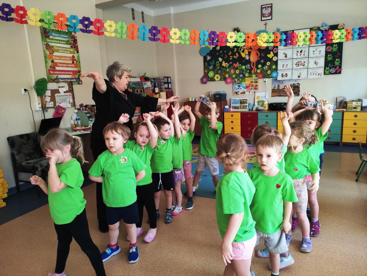 Dzieci z grupy Żabek rozwijały sprawność fizyczną poprzez zabawy ruchowe i ćwiczenia gimnastyczne z wykorzystaniem butelek z wodą mineralną. Zajęcia z nietypowymi przyborami sprawiły dzieciom dużo frajdy. Na zakończenie ćwiczeń dzieci piły wodę - najzdrowszy napój na naszej planecie. Choć samodzielne odkręcenie butelki nie było łatwym zadaniem. Udało się to tylko 3 dziewczynkom. Brawa dla Natalii, Neli oraz Róży. Pozostałe dzieci obiecały ćwiczyć tę umiejętność w domu.