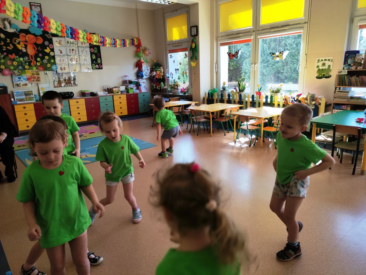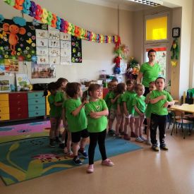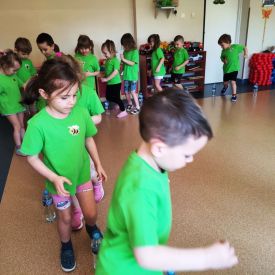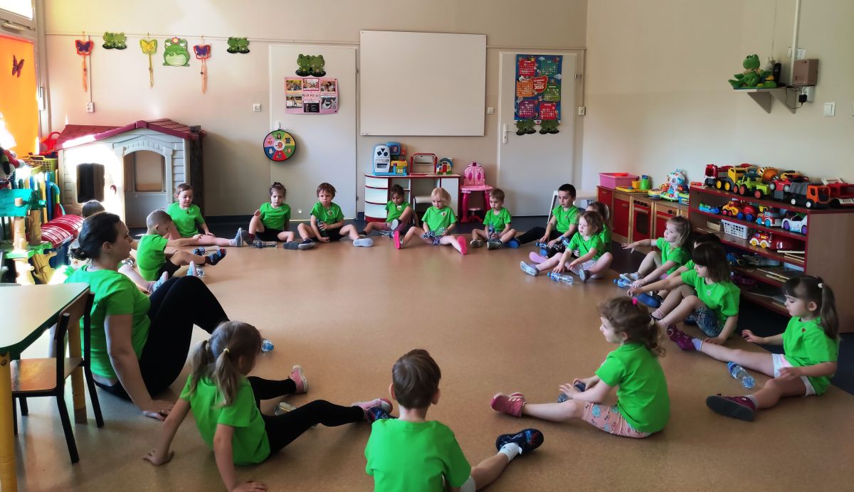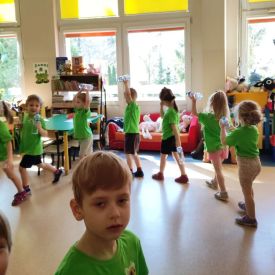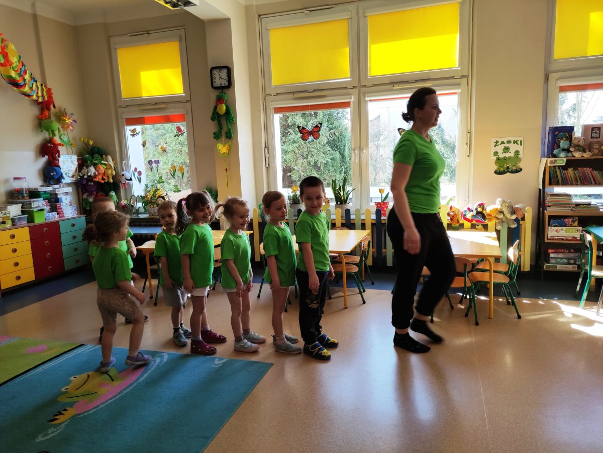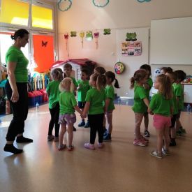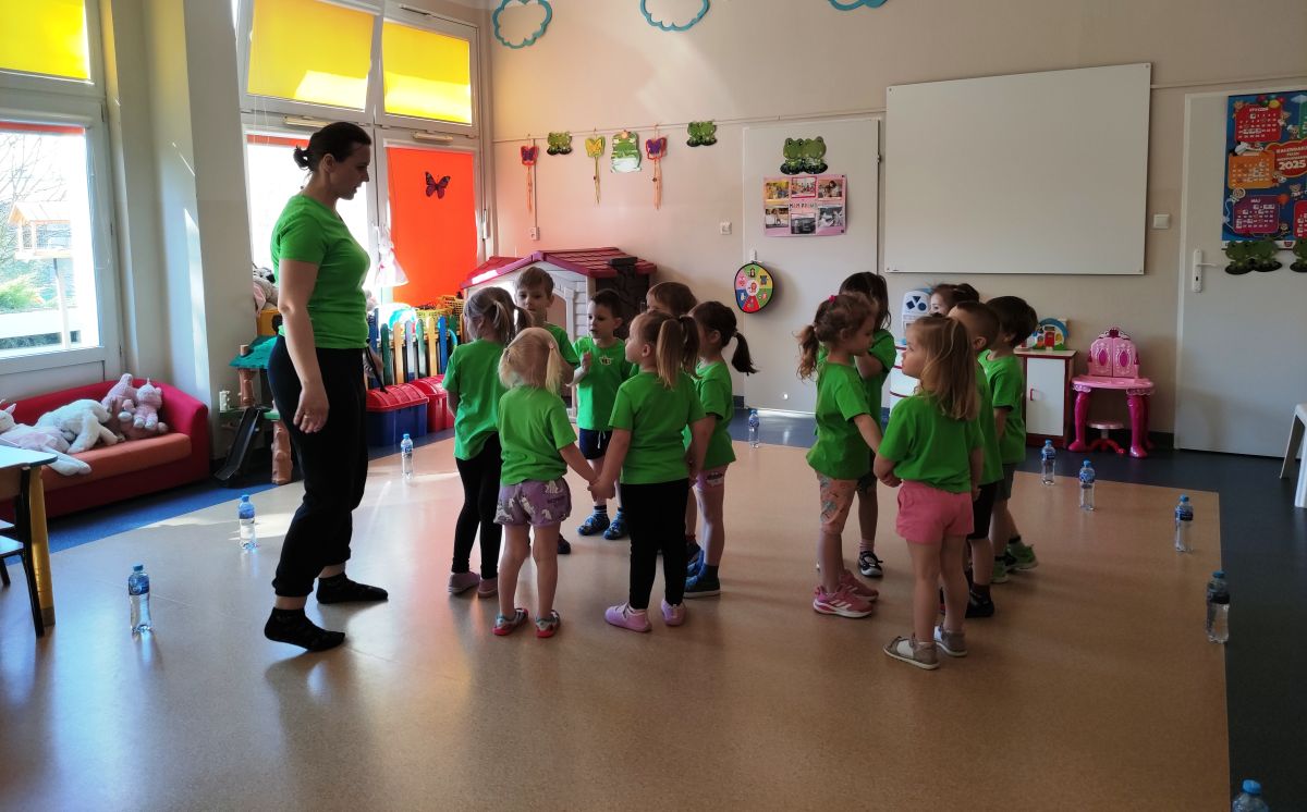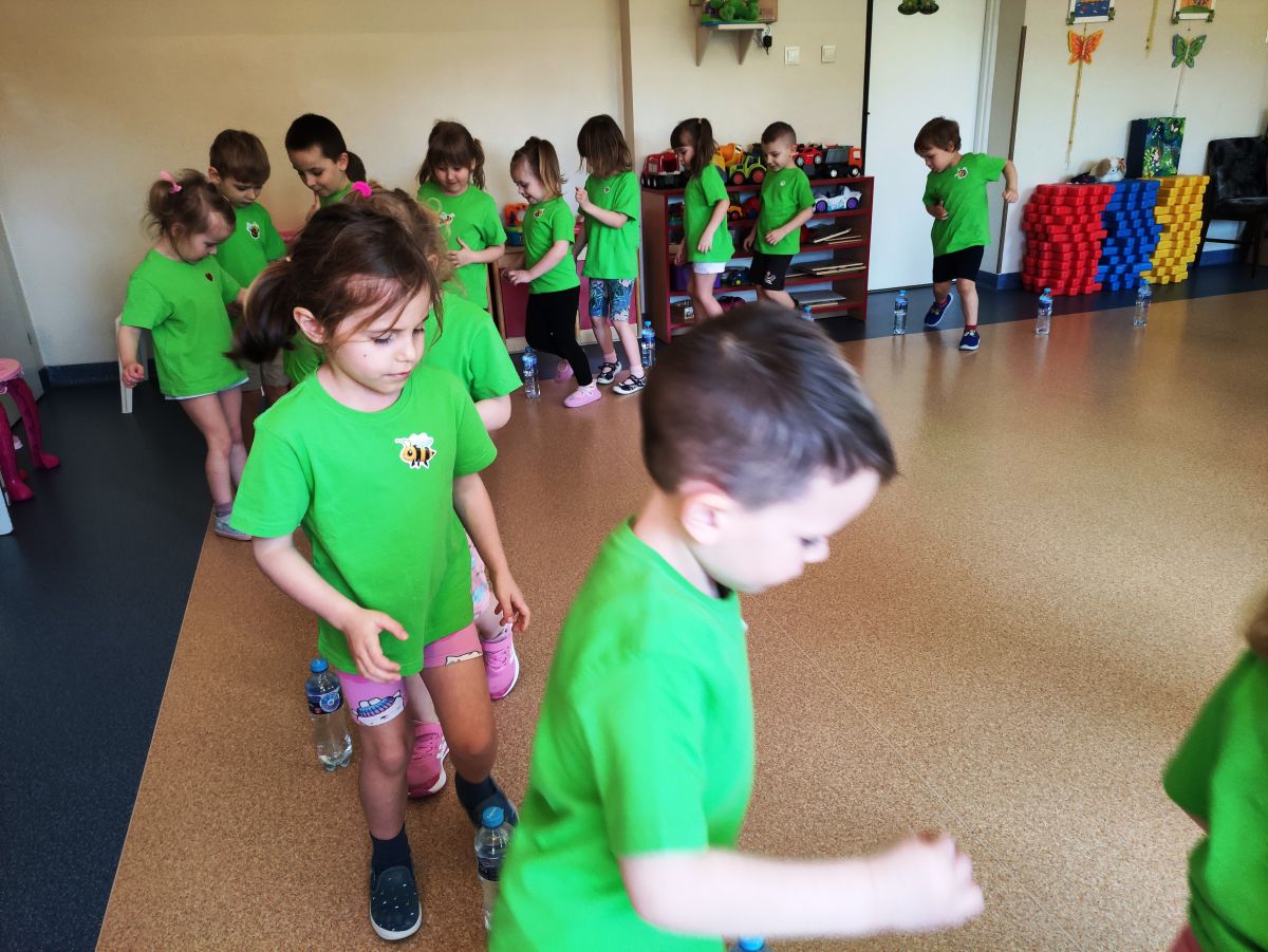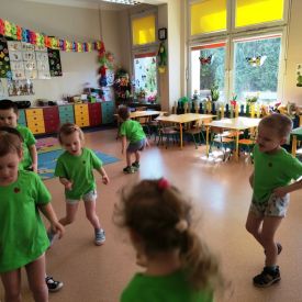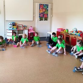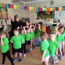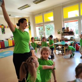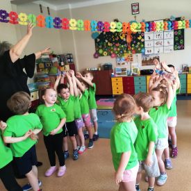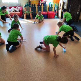 Dzieci z grupy Żabek rozwijały sprawność fizyczną poprzez zabawy ruchowe i ćwiczenia gimnastyczne z wykorzystaniem butelek z wodą mineralną. Zajęcia z nietypowymi przyborami sprawiły dzieciom dużo frajdy. Na zakończenie ćwiczeń dzieci piły wodę - najzdrowszy napój na naszej planecie. Choć samodzielne odkręcenie butelki nie było łatwym zadaniem. Udało się to tylko 3 dziewczynkom. Brawa dla Natalii, Neli oraz Róży. Pozostałe dzieci obiecały ćwiczyć tę umiejętność w domu.