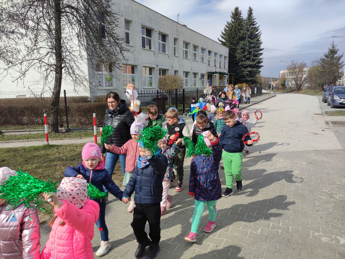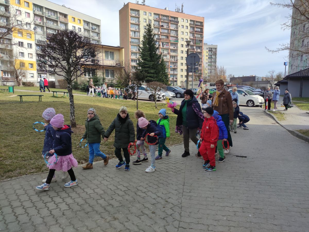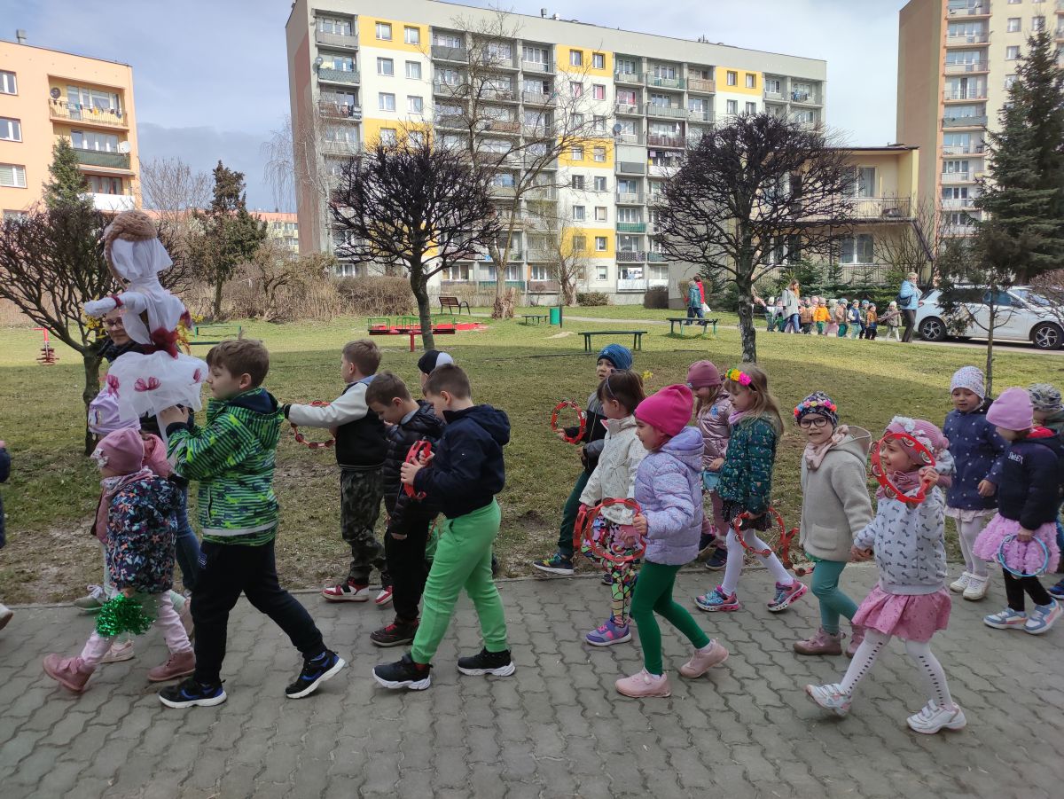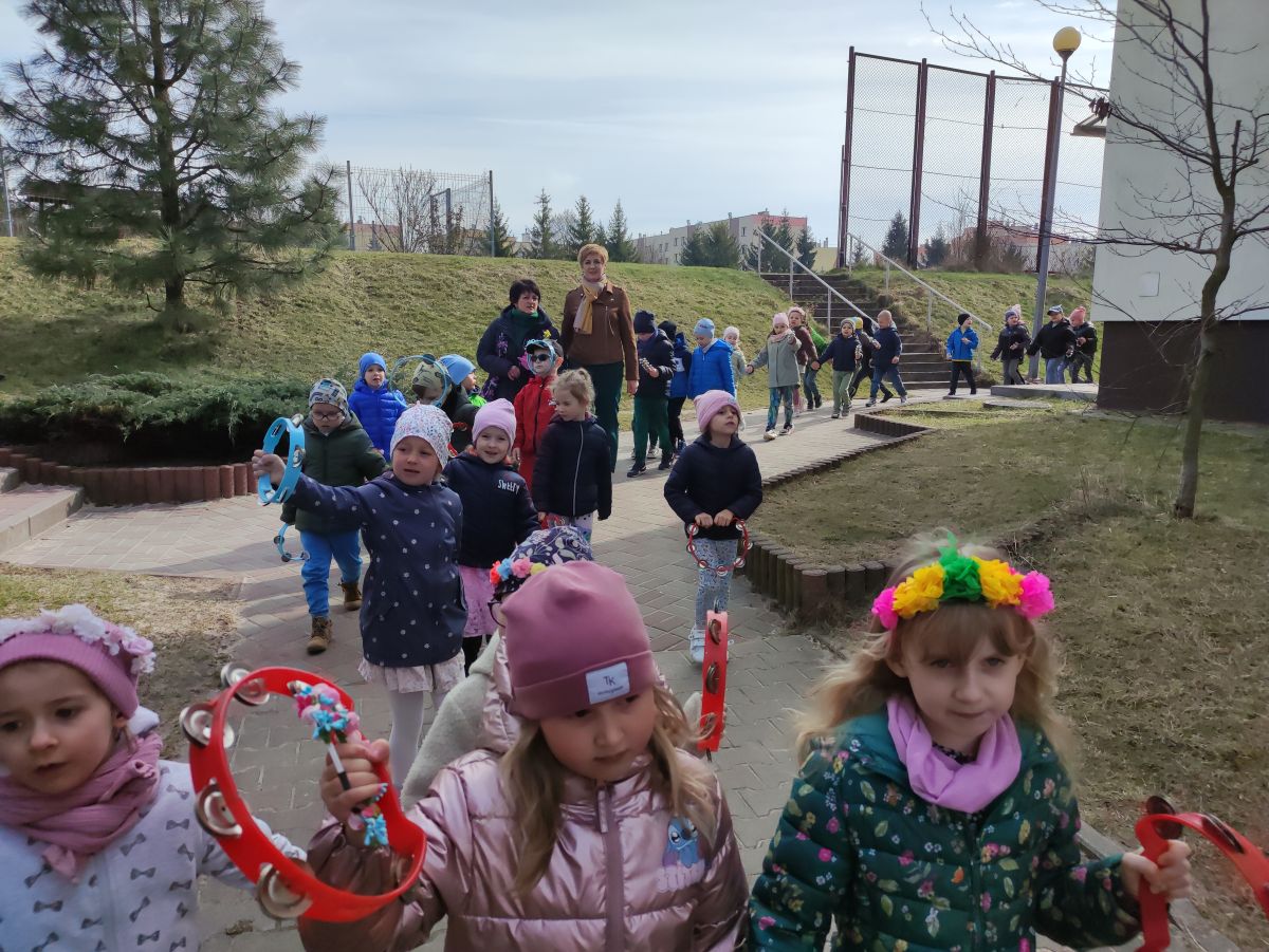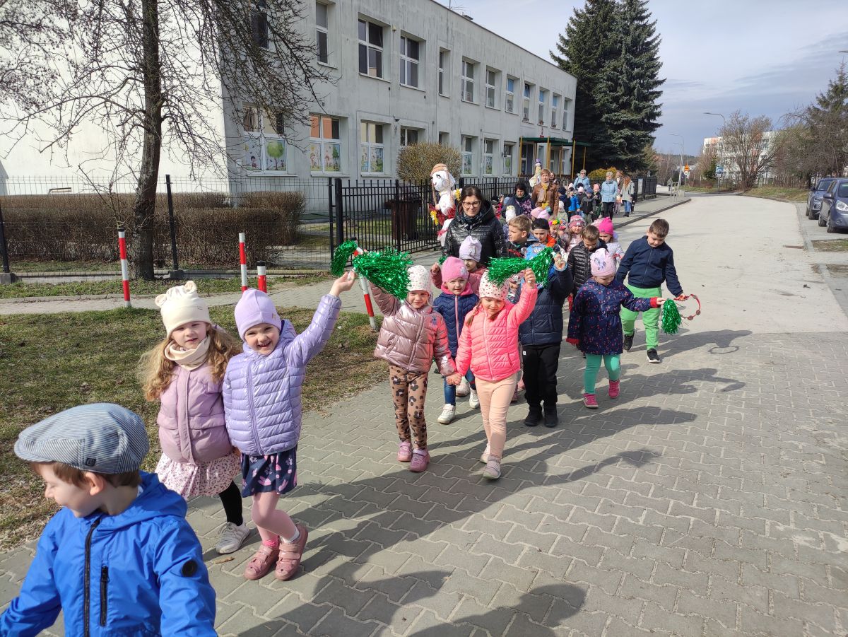 20 marca wszystkie przedszkolaki wyruszyły w barwnym korowodzie po osiedlu, by oznajmić wszystkim, że przyszła wiosna. Dzieci wznosiły radosne okrzyki, śpiewały piosenki oraz grały na instrumentach. Mijani przechodnie obdarzali dzieci uśmiechem i razem z przedszkolakami cieszyli się, że zima już odeszła za morze.
