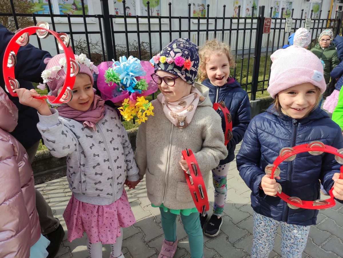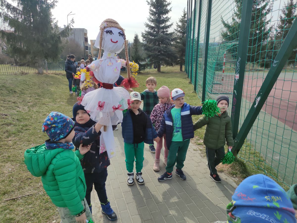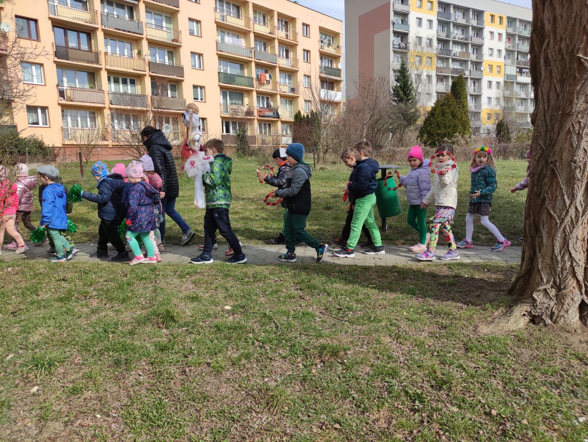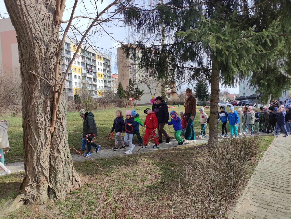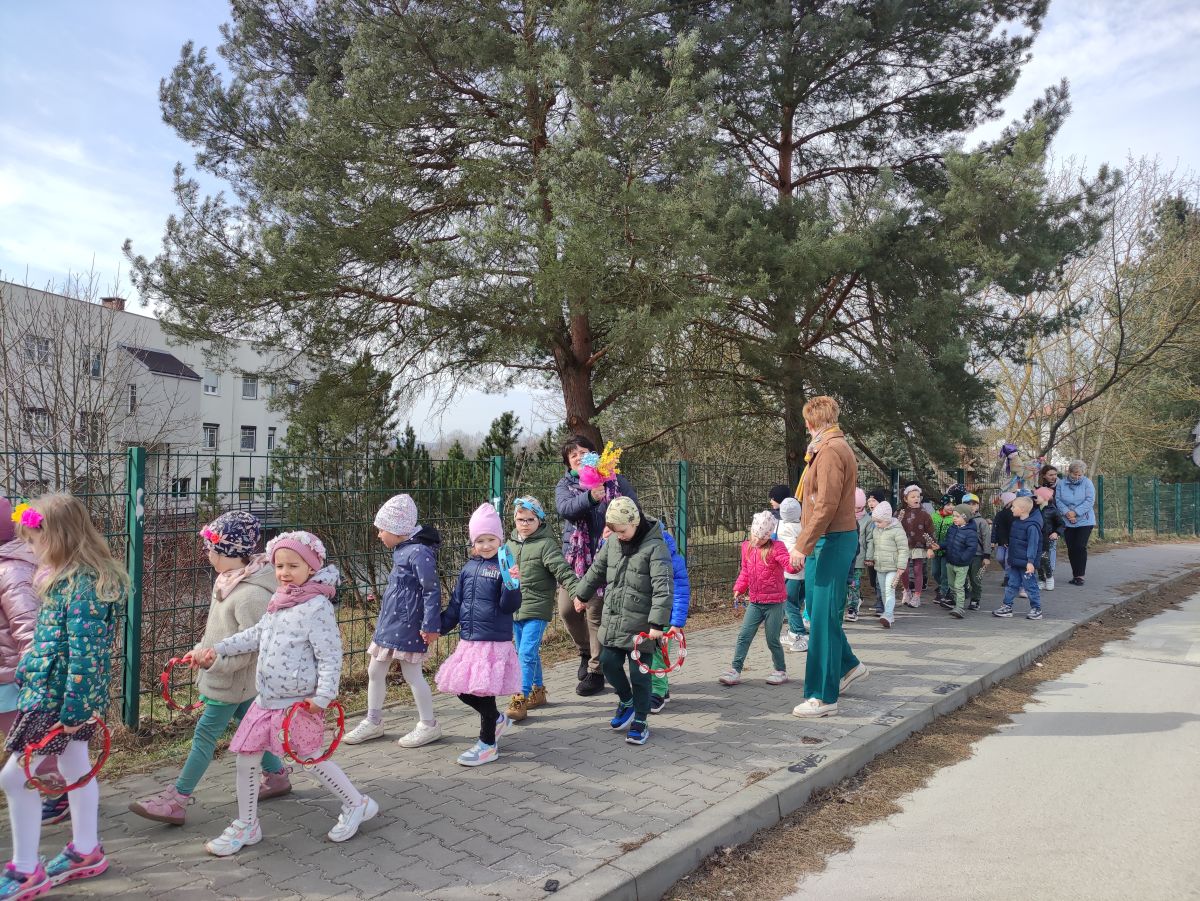 20 marca wszystkie przedszkolaki wyruszyły w barwnym korowodzie po osiedlu, by oznajmić wszystkim, że przyszła wiosna. Dzieci wznosiły radosne okrzyki, śpiewały piosenki oraz grały na instrumentach. Mijani przechodnie obdarzali dzieci uśmiechem i razem z przedszkolakami cieszyli się, że zima już odeszła za morze.