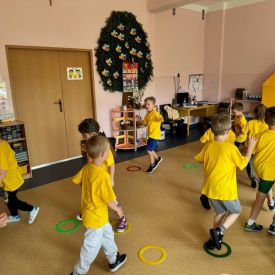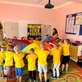 Przedszkolaki obejrzały filmy edukacyjne: „Z kamerą wśród pszczół” oraz „Kazio ratuje pszczoły”. Została przeprowadzona rozmowa z dziećmi na temat ogromnej roli pszczół w życiu ludzi i przyrody. Przedszkolaki zapoznały się z rozwojem pszczół. Dzieci bawiły się z chustą animacyjną w zabawę „Pszczoły do Ula” oraz „Zapylanie”.