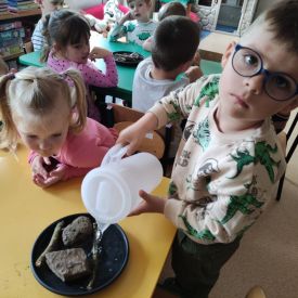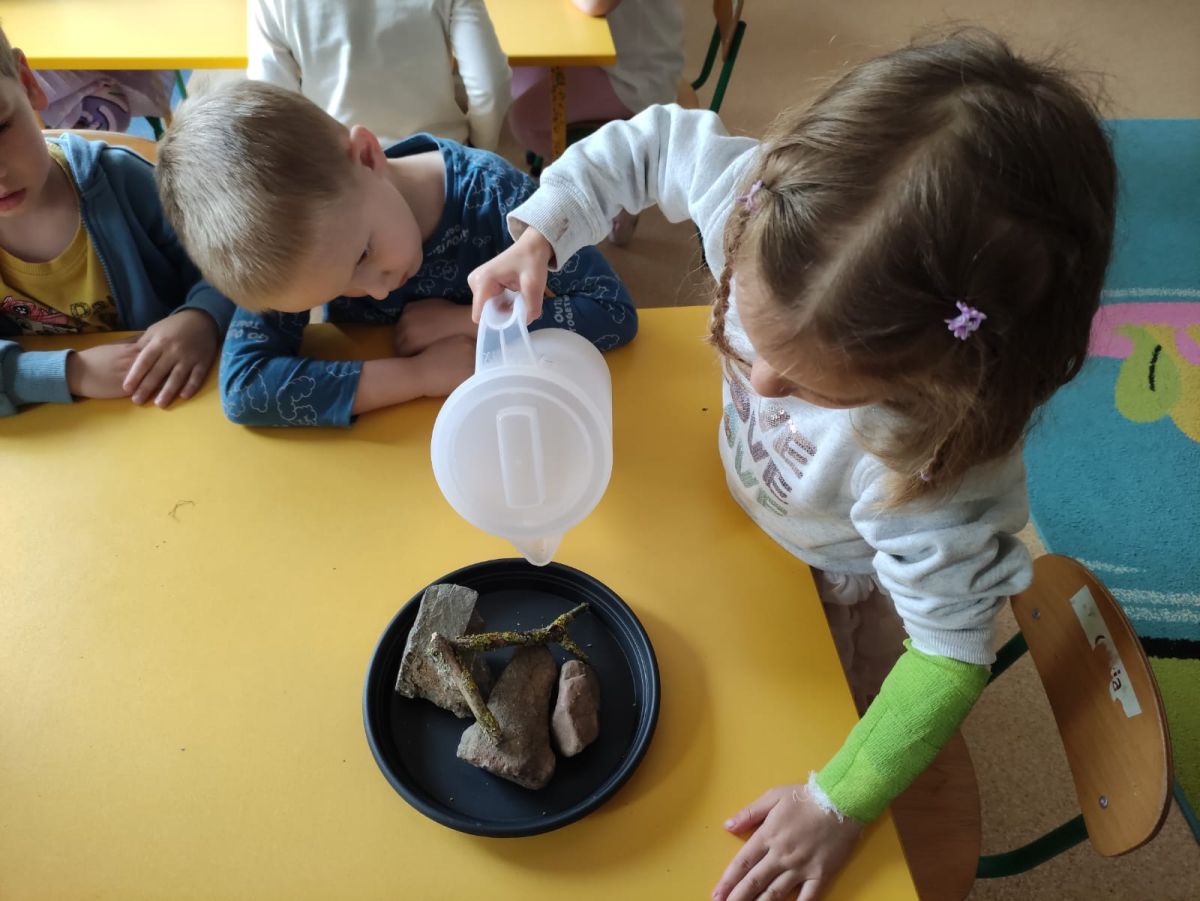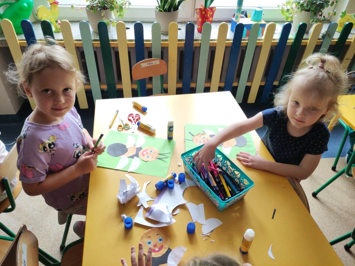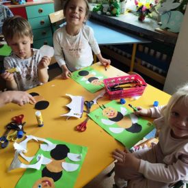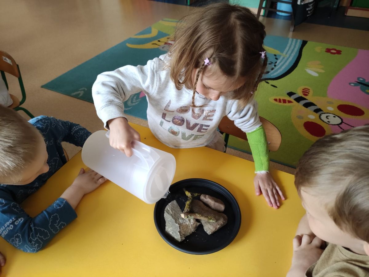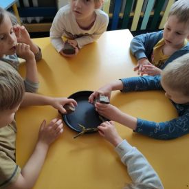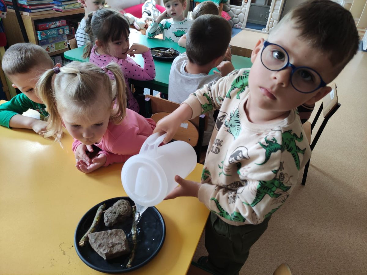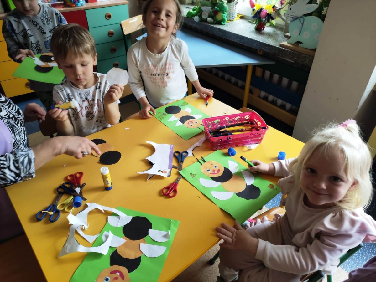 Przedszkolaki w zespołach zrobiły poidełka dla pszczół, które następnie rozstawiły w naszym ogrodzie przedszkolnym.