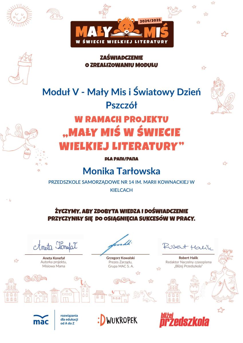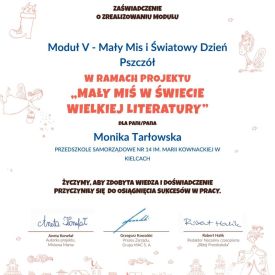 Przedszkolaki z grupy Żabek z okazji Światowego Dnia Pszczół pogłębiły wiedzę na temat ogromnego znaczenia pszczół w przyrodzie i przy okazji zrealizowały ostatni moduł z projektu Mały Miś w Świecie Wielkiej Literatury.