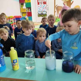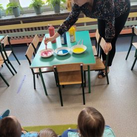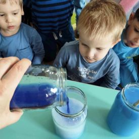 - Barwienie wody: Dzieci mogły uczestniczyć w różnorodnych eksperymentach związanych z wodą. Zabawa z barwieniem wody na różne kolory podstawowe i pochodne była zarówno edukacyjna, jak i rozrywkowa. Przedszkolaki mogły obserwować, jak zmienia się kolor wody w zależności od dodanych barwników.