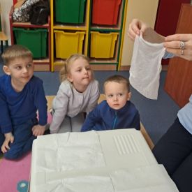 Suszenie mokrego ręcznika papierowego suszarką i porównywanie z tym, który nie był suszony: Przedszkolaki mogły zanurzyć dwa identyczne ręczniki papierowe w wodzie, a następnie wyjąć jeden i suszyć go suszarką, podczas gdy drugi pozostaje mokry. Po suszeniu dzieci mogły porównać oba ręczniki i zauważyć różnice w wyglądzie, teksturze i wadze, co pokazuje, jak woda wpływa na materiały i jak działają suszarki.
