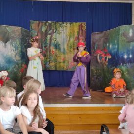 Uczniowie spisali się wspaniale a mali widzowie z zaciekawieniem oglądali przedstawieniei gromkimi brawami oraz promiennym uśmiechempodziękowali za występ.