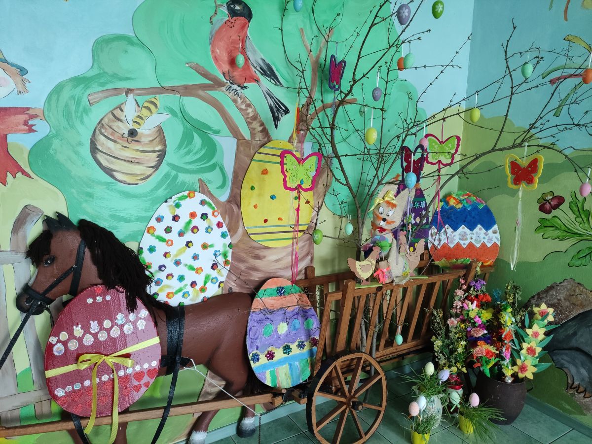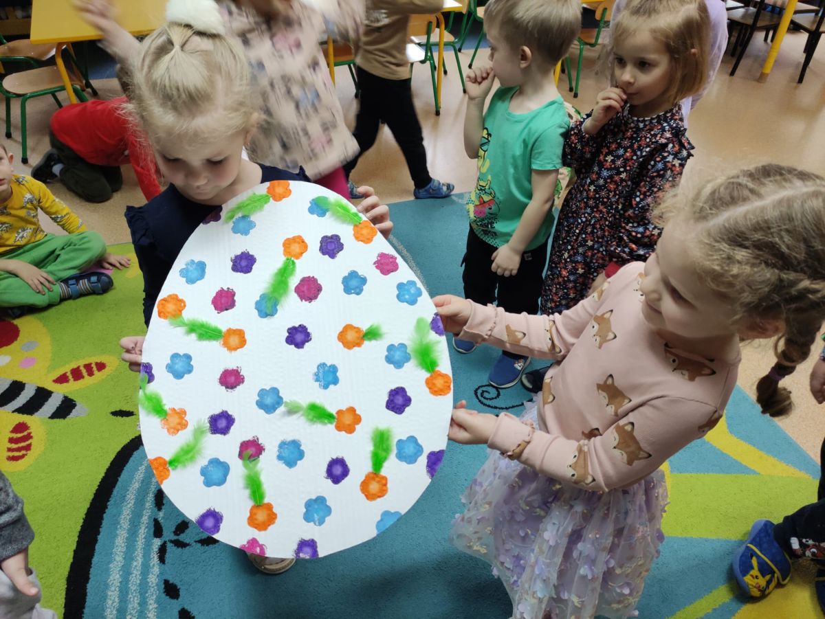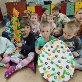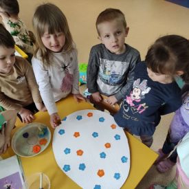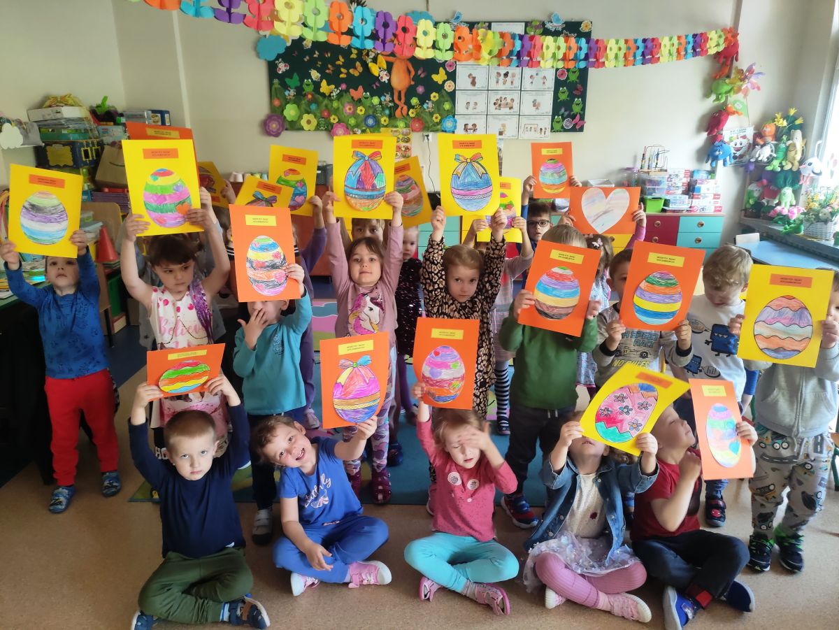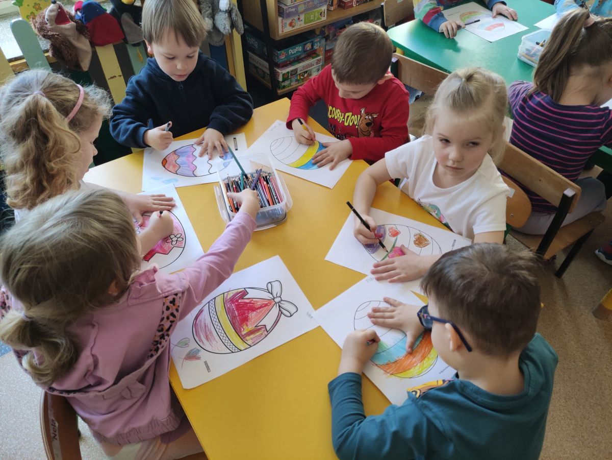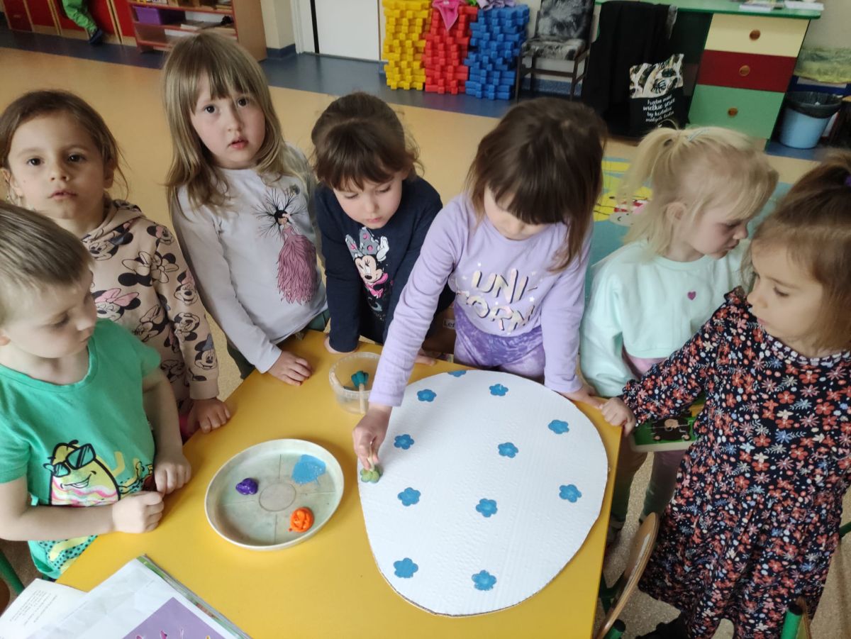 Tuż przed świętami wielkanocnymi panowała w naszym przedszkolu świąteczna atmosfera. Tworzenie palm wielkanocnych, kartek z życzeniami, stroików z rzeżuchy, bukszpanów . Z każdym dniem w naszych salach, holu przedszkolnym przybywało wielkanocnych symboli.