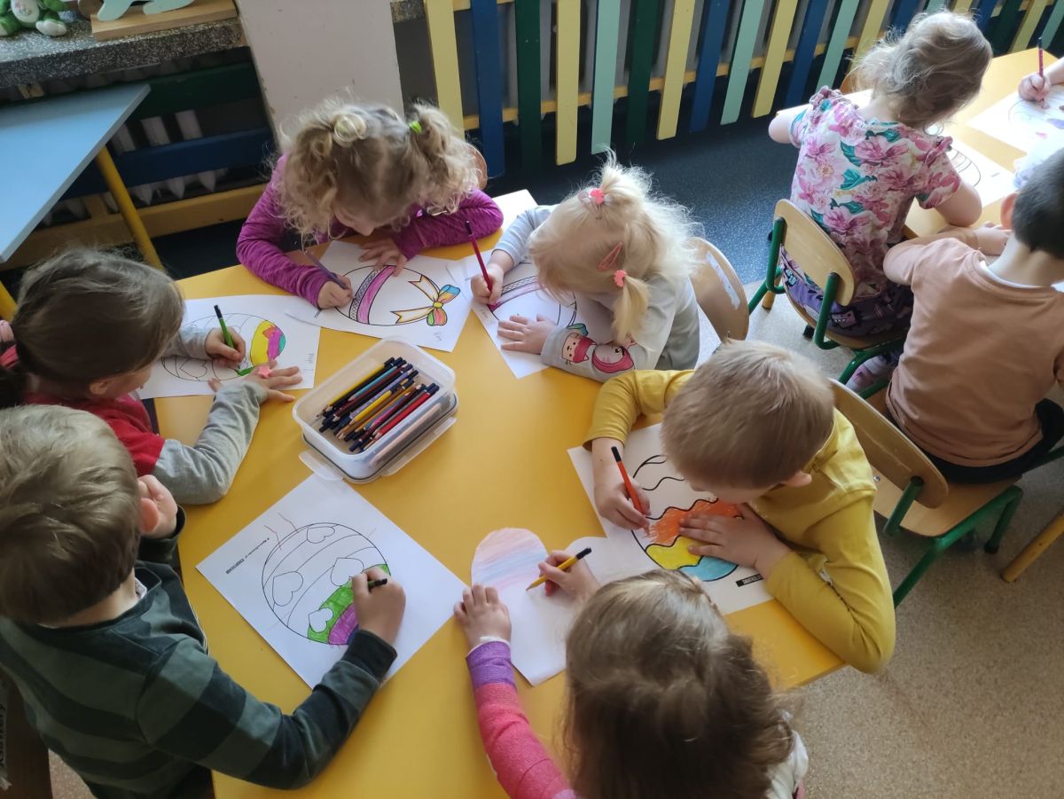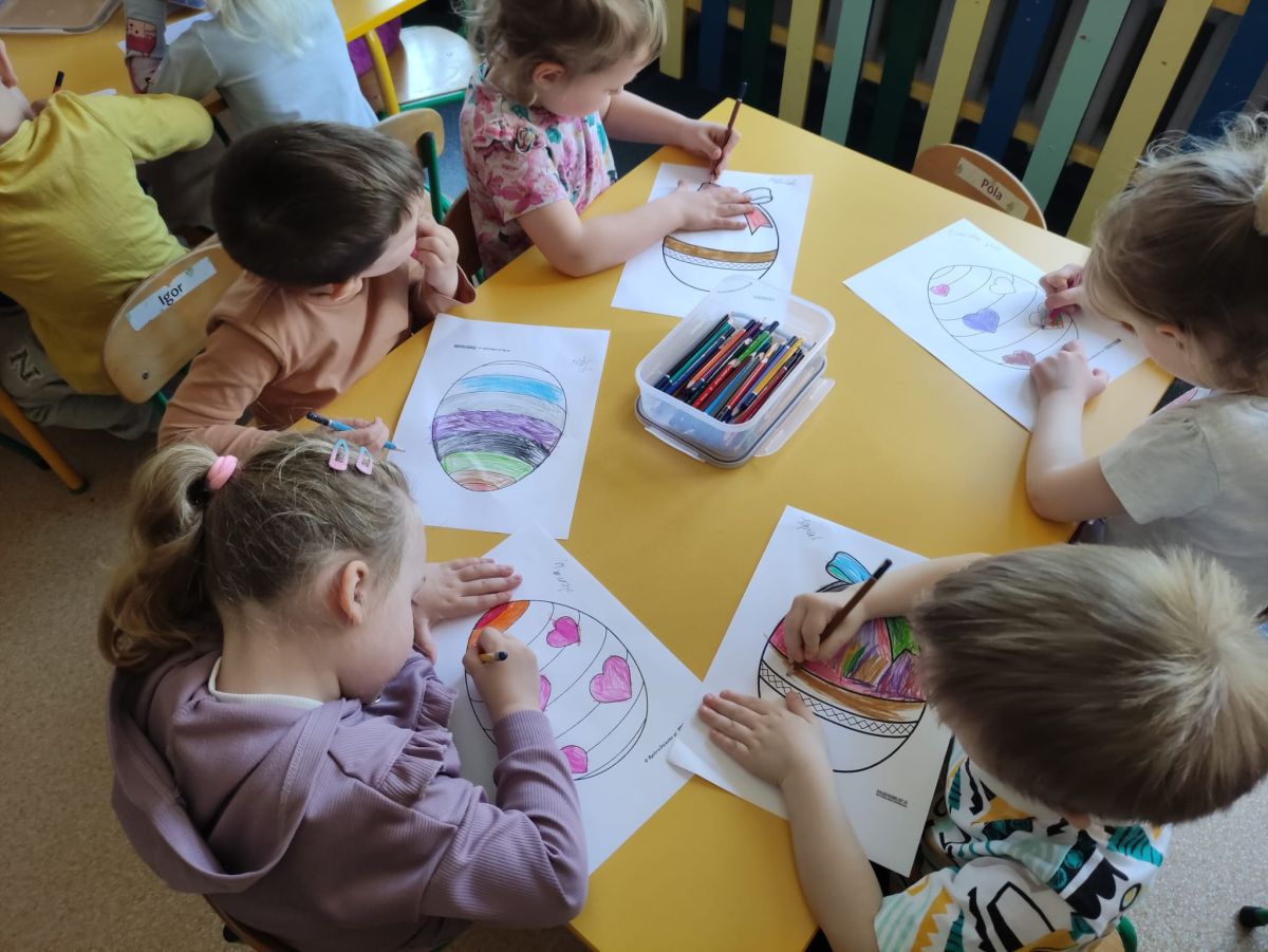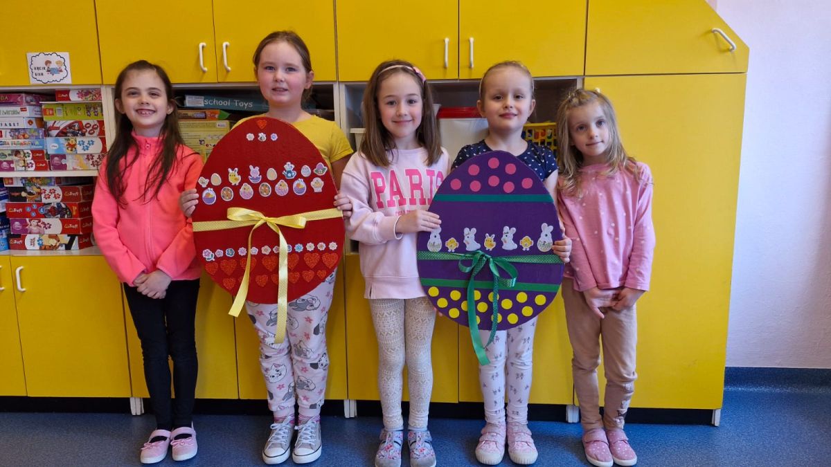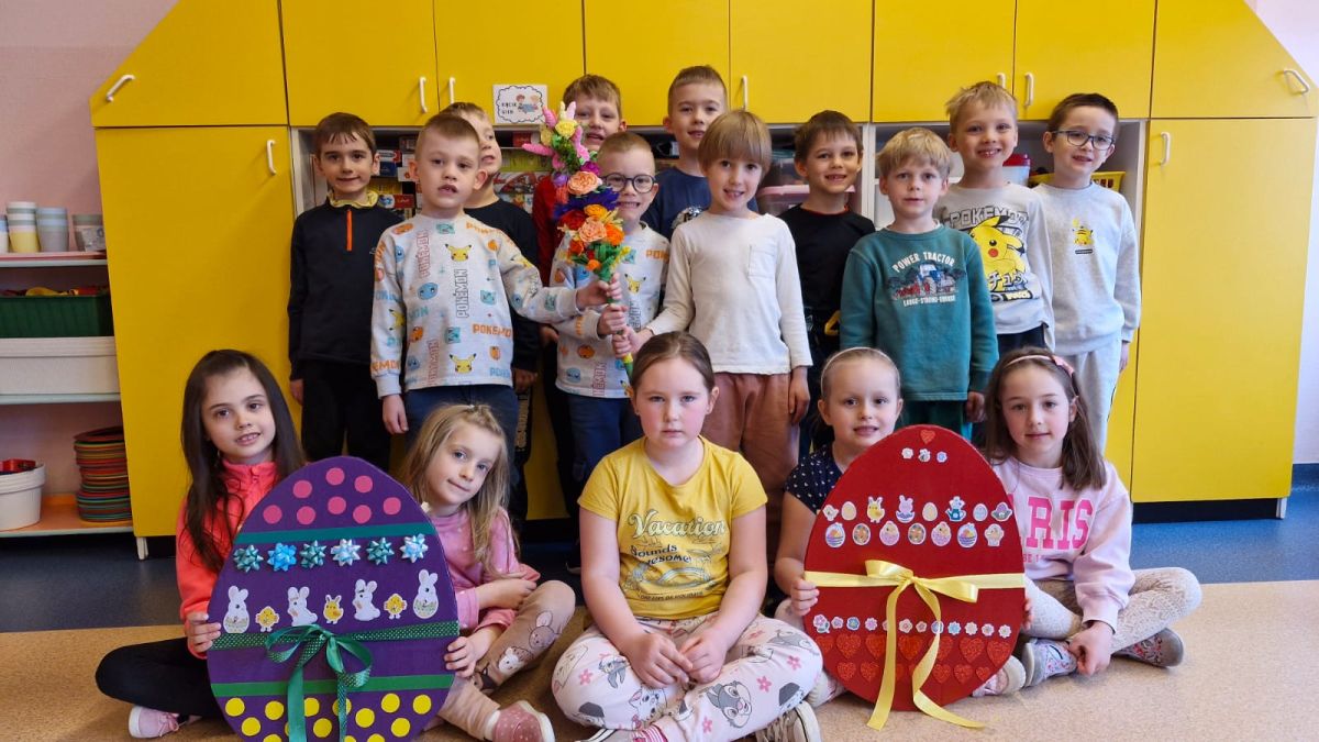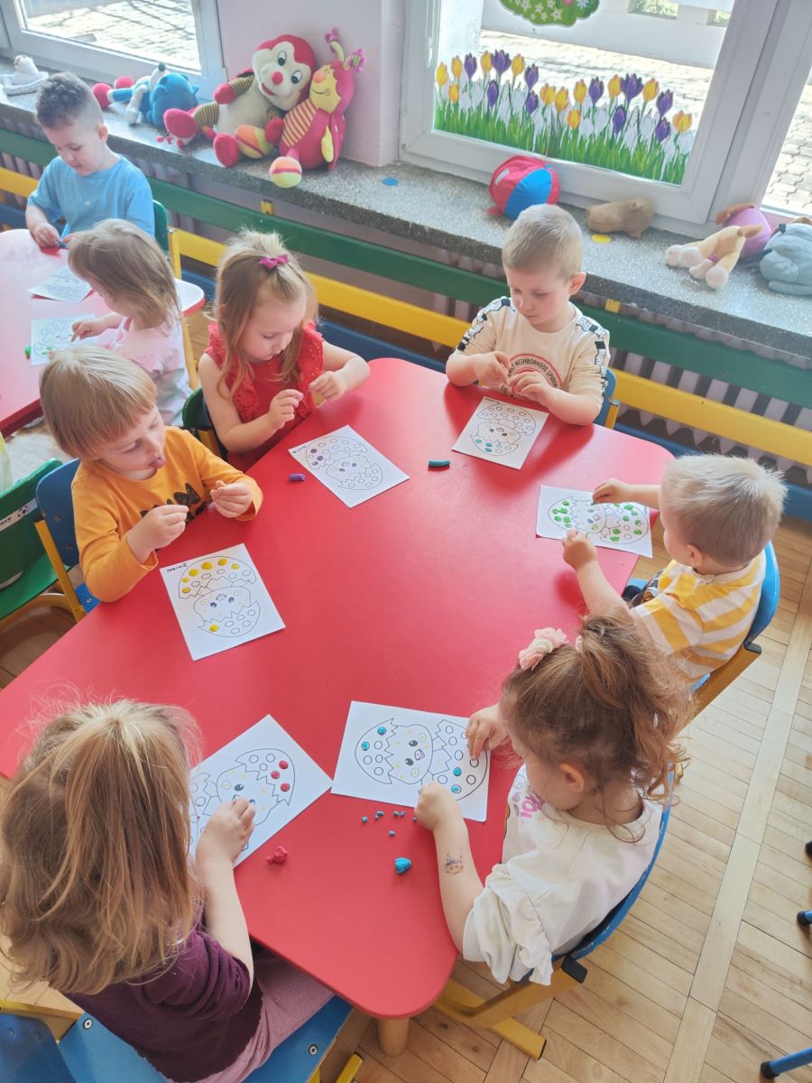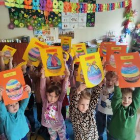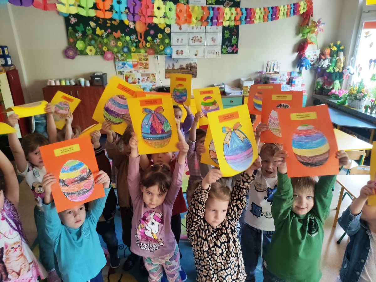 Tuż przed świętami wielkanocnymi panowała w naszym przedszkolu świąteczna atmosfera. Tworzenie palm wielkanocnych, kartek z życzeniami, stroików z rzeżuchy, bukszpanów . Z każdym dniem w naszych salach, holu przedszkolnym przybywało wielkanocnych symboli.