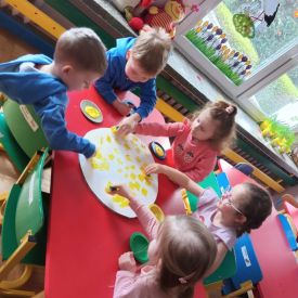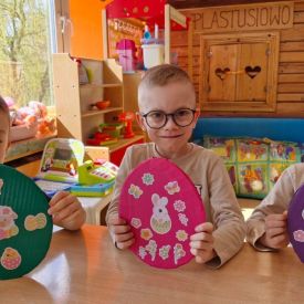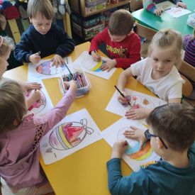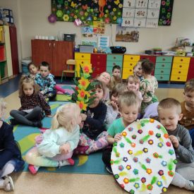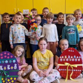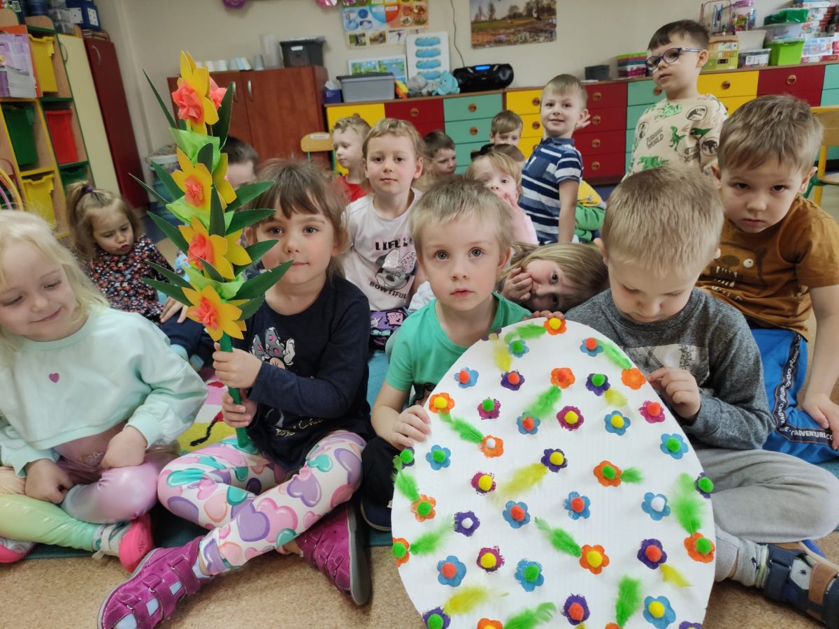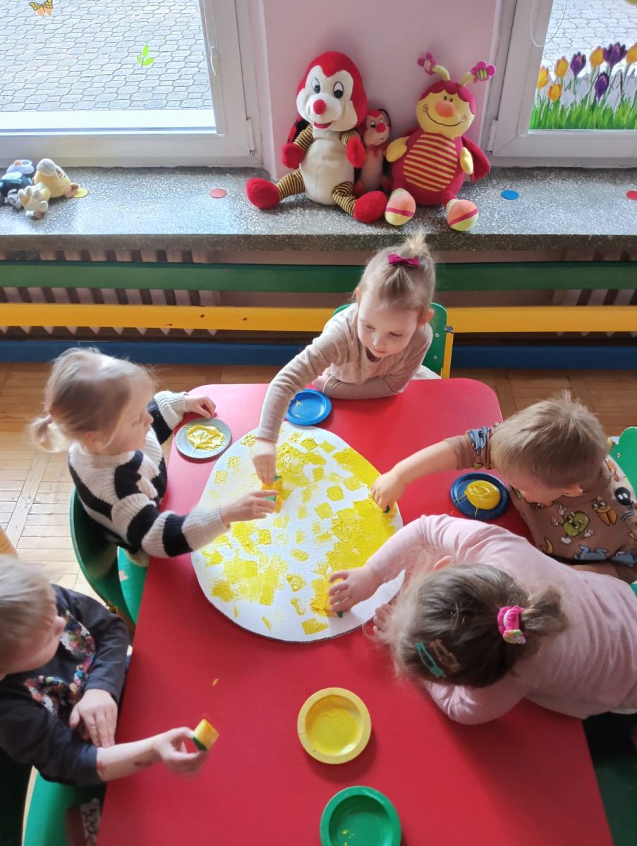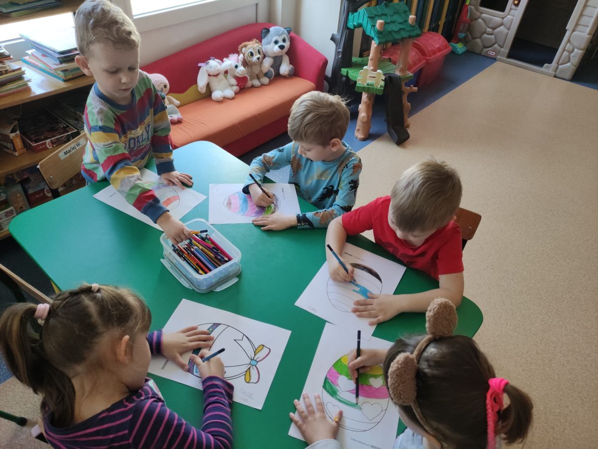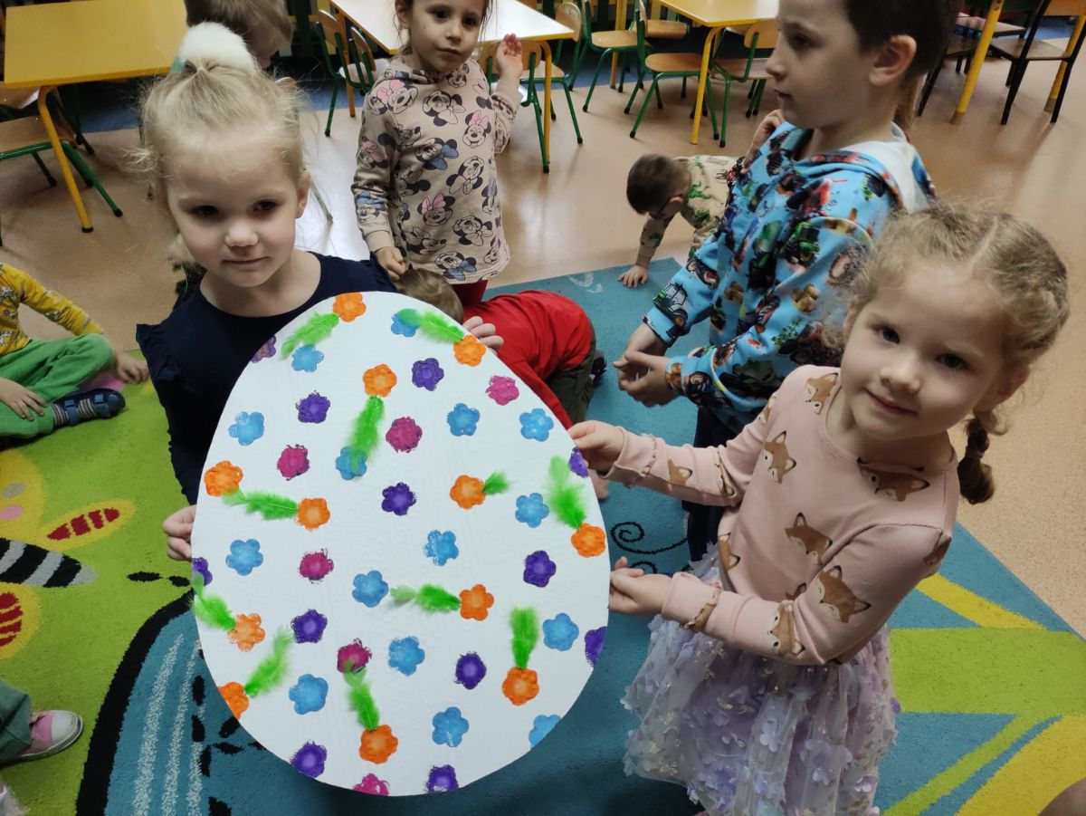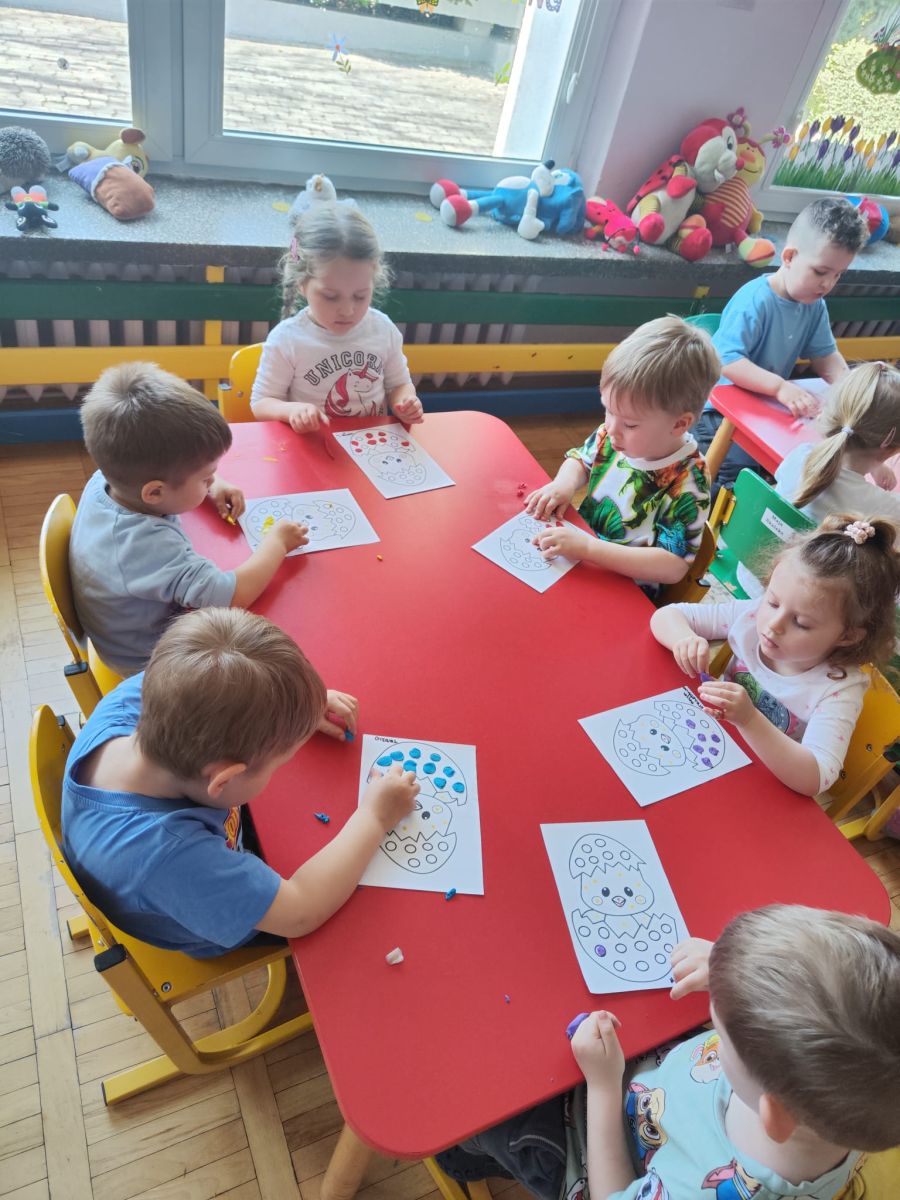 Tuż przed świętami wielkanocnymi panowała w naszym przedszkolu świąteczna atmosfera. Tworzenie palm wielkanocnych, kartek z życzeniami, stroików z rzeżuchy, bukszpanów . Z każdym dniem w naszych salach, holu przedszkolnym przybywało wielkanocnych symboli.